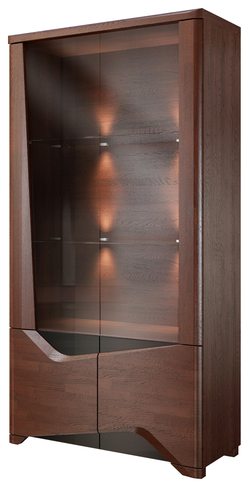 Dvojitá vitrína Rimini 2D2DS vás zaujme svým moderním a luxusním designem. Je vyrobena z masivního dubového dřeva, přírodní dubové dýhy a skla Antisol. Speciální technologie lakování a moření dodává nábytku přirozený vzhled dřeva a zdůrazňuje jeho strukturu lét. Jedinečným prvkem jsou dvířka s vyřezávanými a černě lakovanými detaily. Celý systém má jednoduchý dotykový systém otevírání - Push to open.