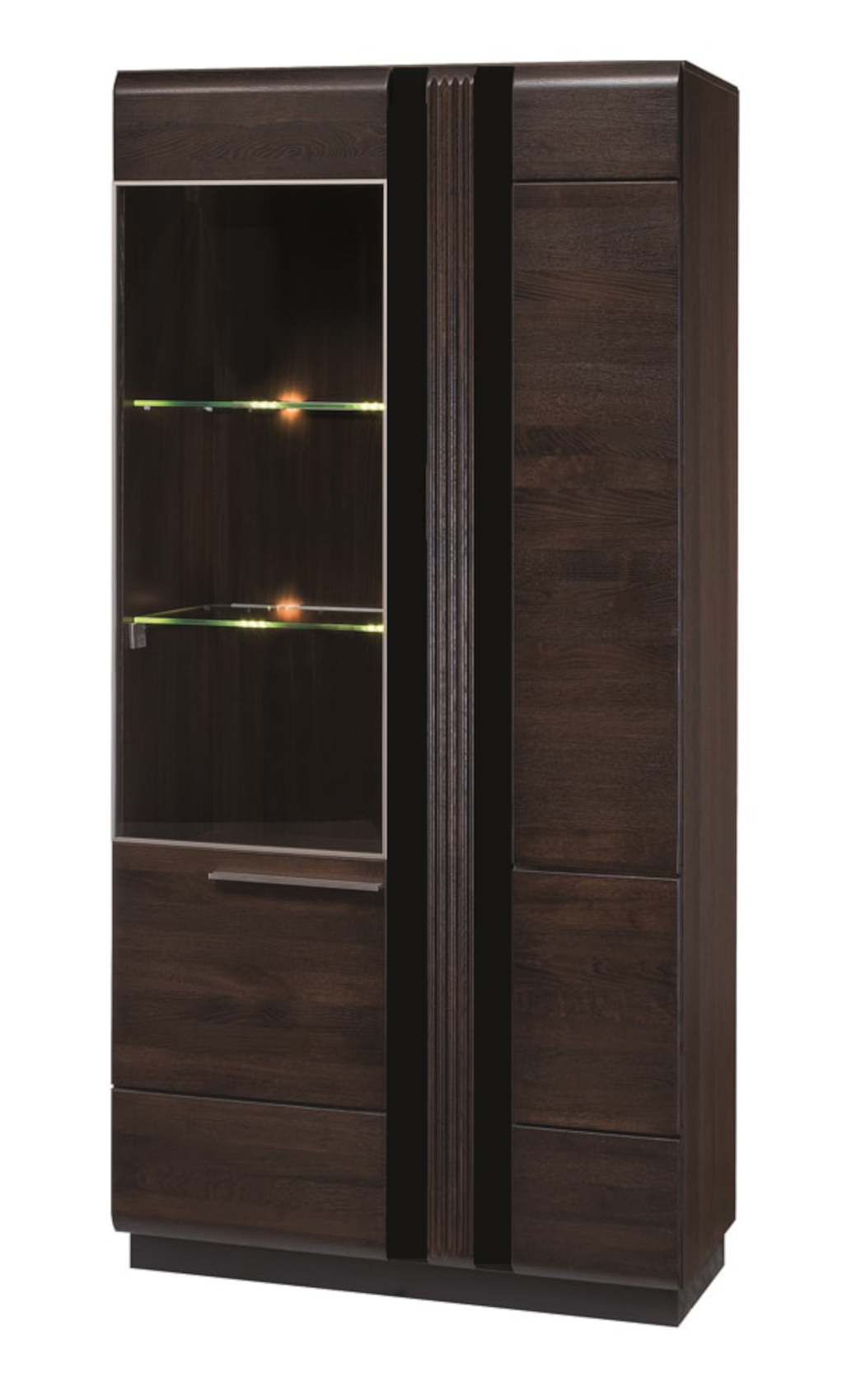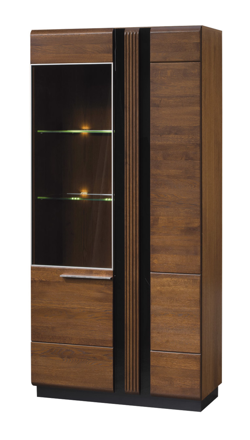 Moderní dvoudveřová široká vitrína Porti 12 vás zaujme svým luxusním designem. Přední část je vyrobena z masivního dubového dřeva s černými skleněnými detaily a korpus je z přírodní dubové dýhy. Celý systém Porti má kovové úchytky. Máte na výběr ze 2 barevných variant.