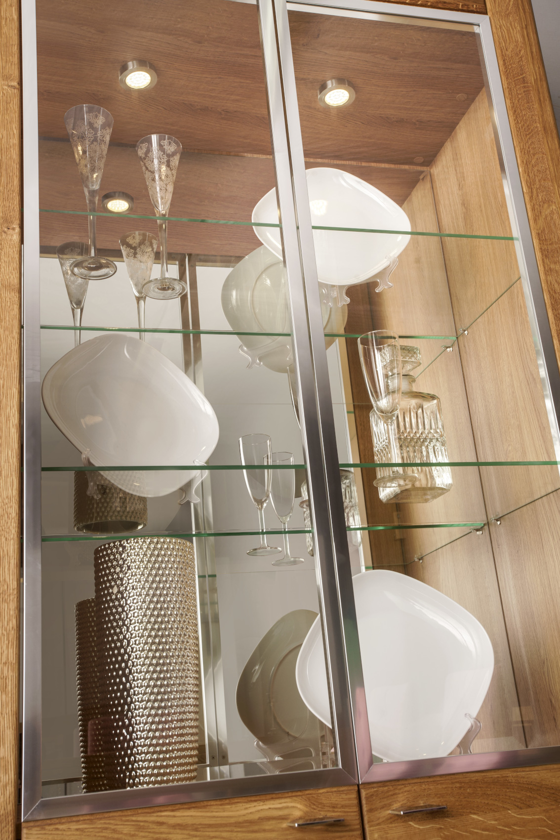 Moderní dvoudveřová vitrína Latina 12 vás zaujme svým přírodním designem se strukturou dřevěných lét s chromovými detaily. Přední dvířka jsou vyrobena z masivního dubového dřeva a korpus z přírodní dubové dýhy. Vitrína stojí na chromových nožkách, které provzdušní celý váš interiér a úchyty jsou vyrobeny také z chromu.