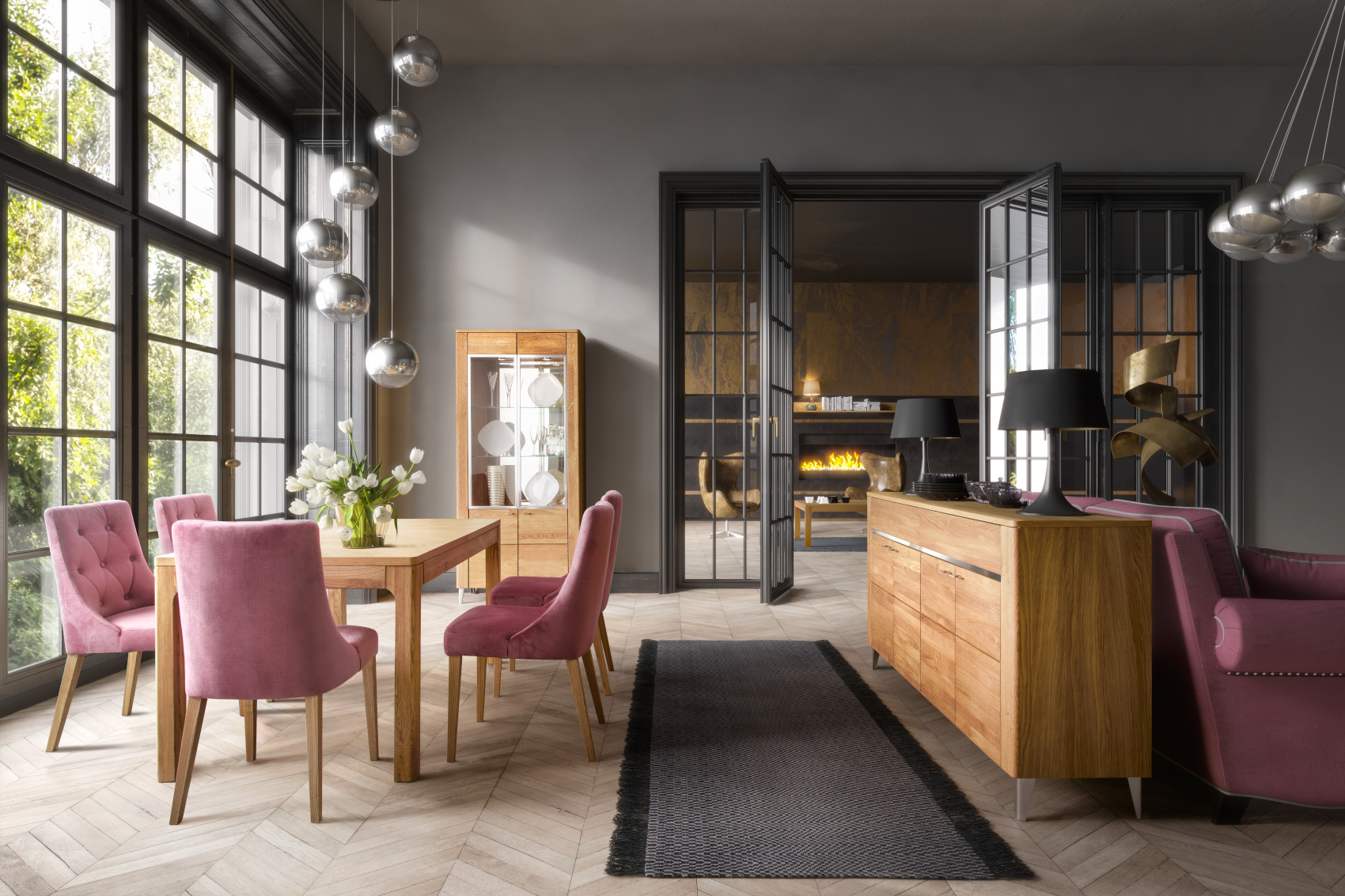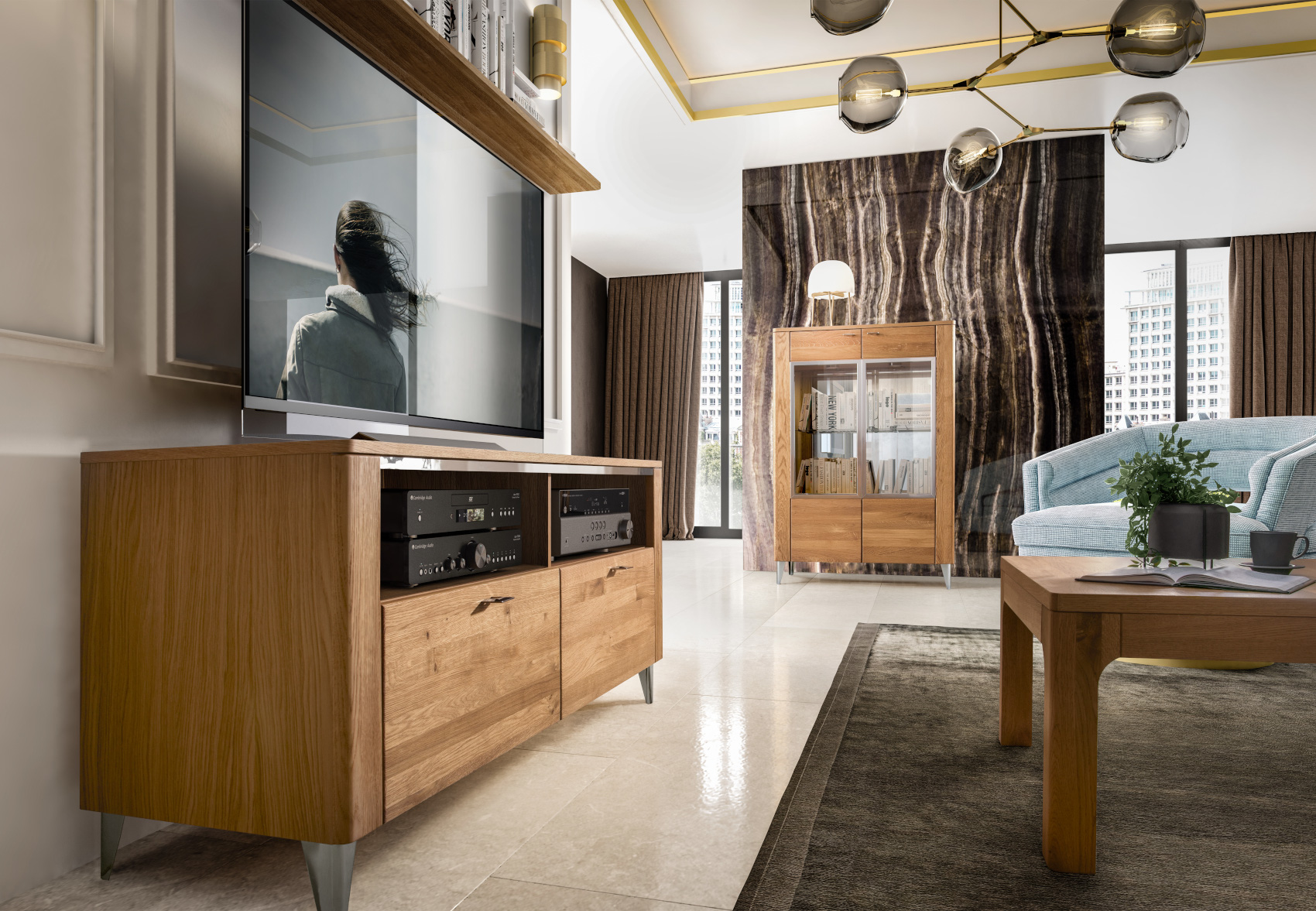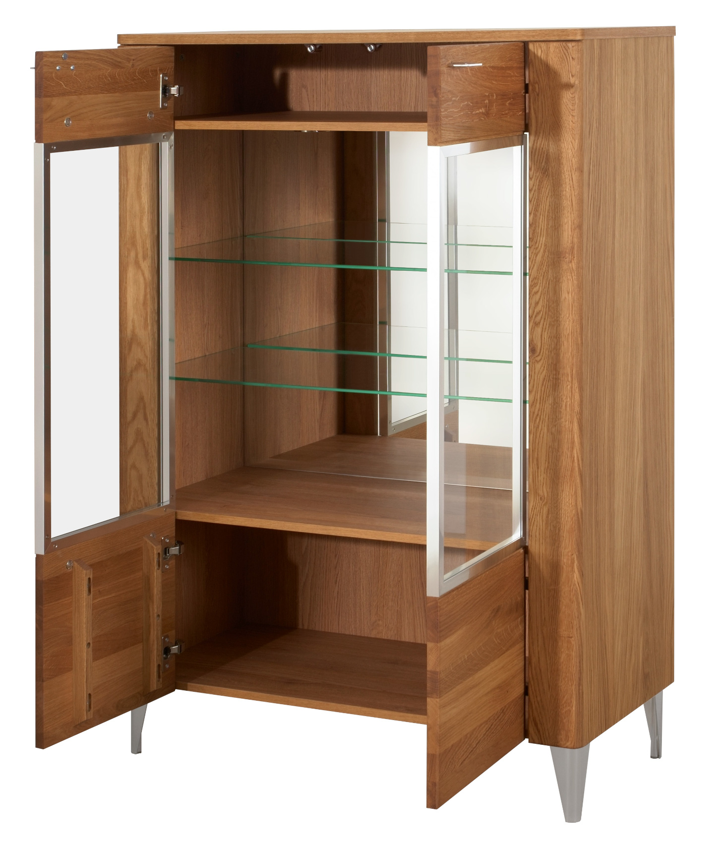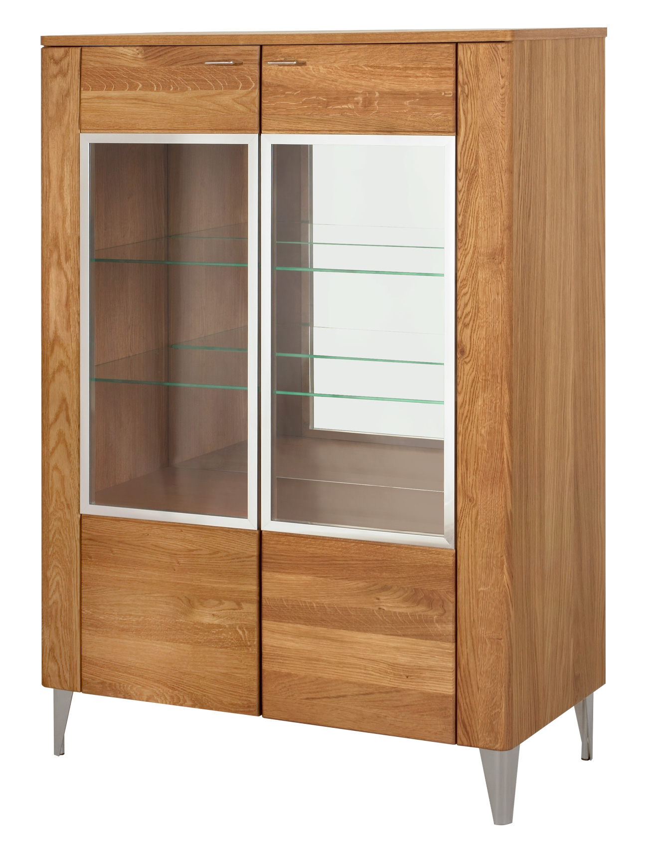Moderní dvoudveřová vitrína Latina 15 nízká vás zaujme svým přírodním designem se strukturou dřevěných lét s chromovými detaily. Přední dvířka jsou vyrobena z masivního dubového dřeva a korpus z přírodní dubové dýhy. Vitrína stojí na chromových nožkách, které provzdušní celý váš interiér a úchyty jsou vyrobeny také z chromu.