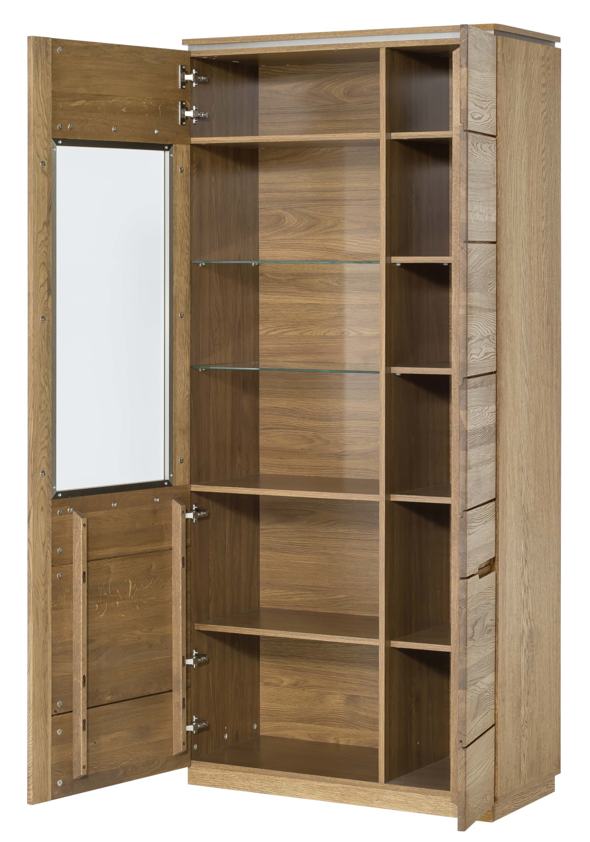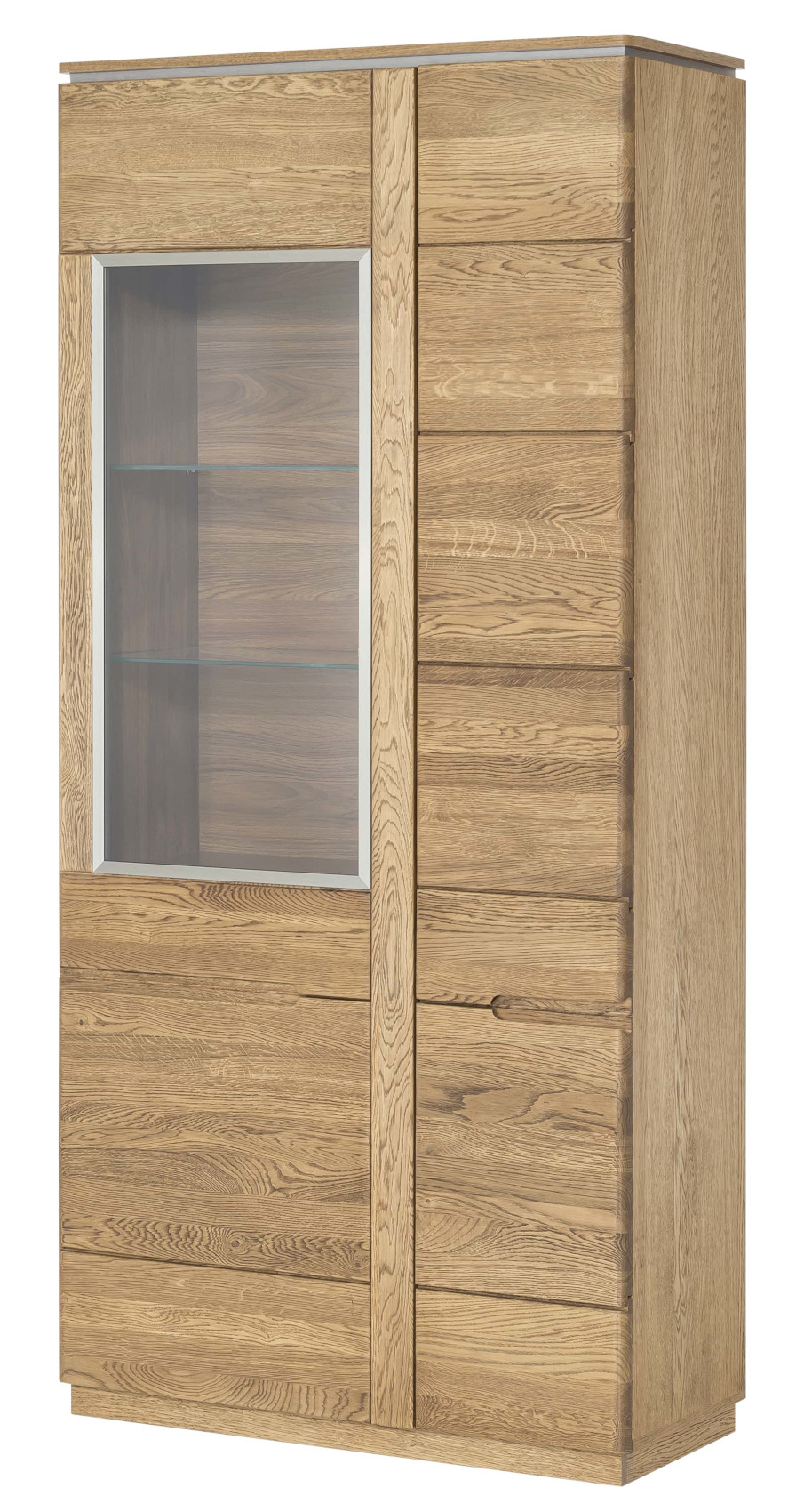 Moderní dvoudveřová vitrína Montenegro 12 vás zaujme svým elegantní designem. Přední část je vyrobena z masivního dubové dřeva a korpus z přírodní dubové dýhy. Jedinečným prvkem celého systému jsou kovové detaily pod horní deskou.