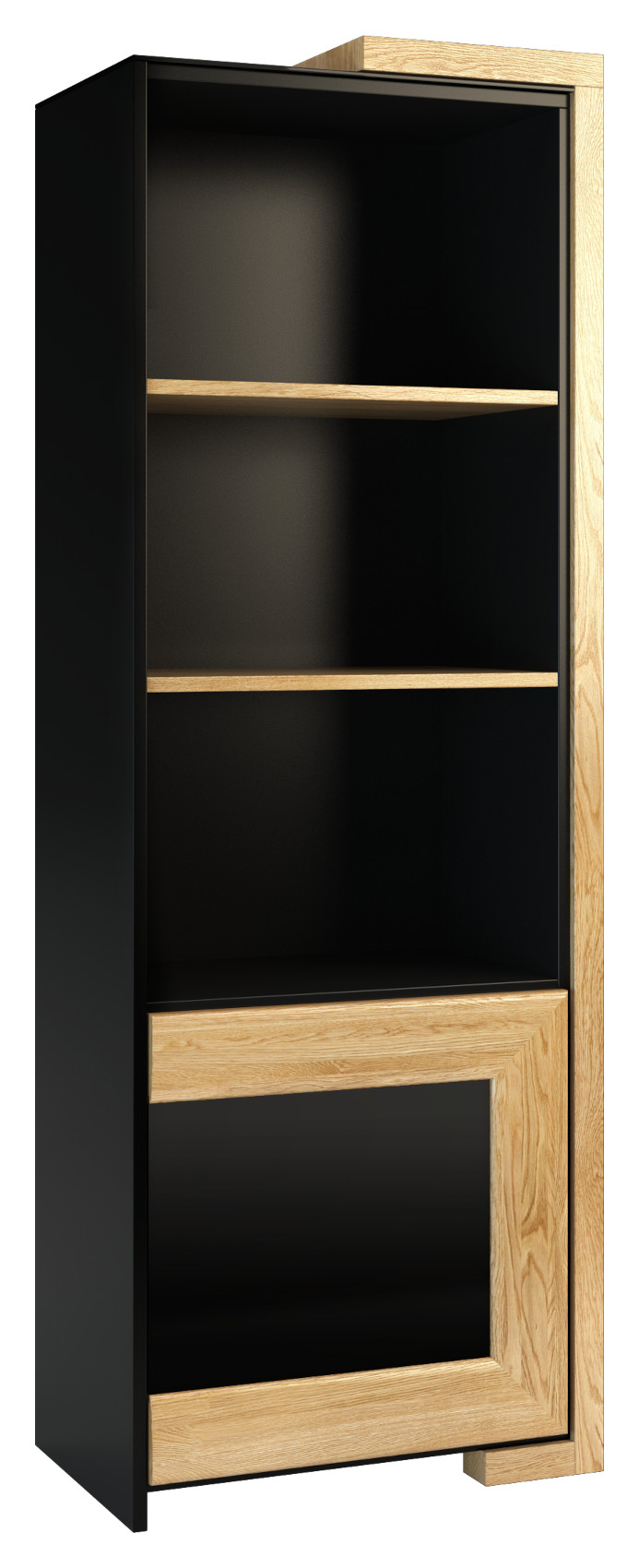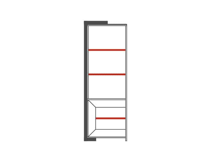 Vitrína má horní část otevřenou se 2 lakovanými policemi. Ve spodní části jsou dvířka, za kterými je vložena 1 lakovaná police.