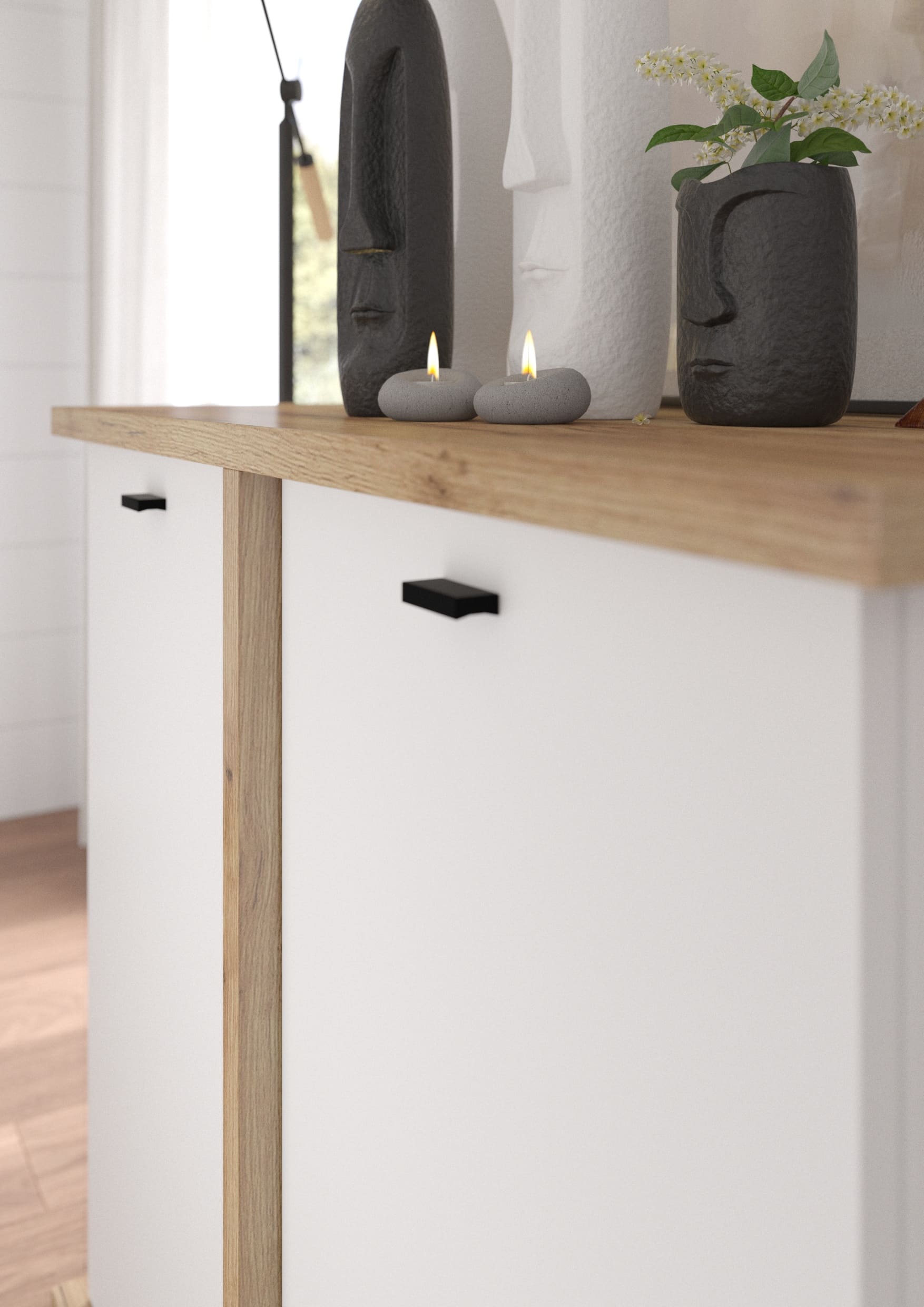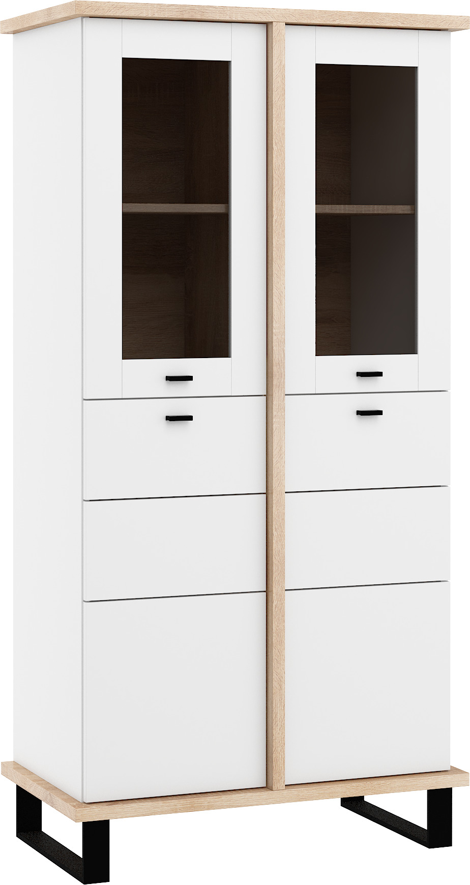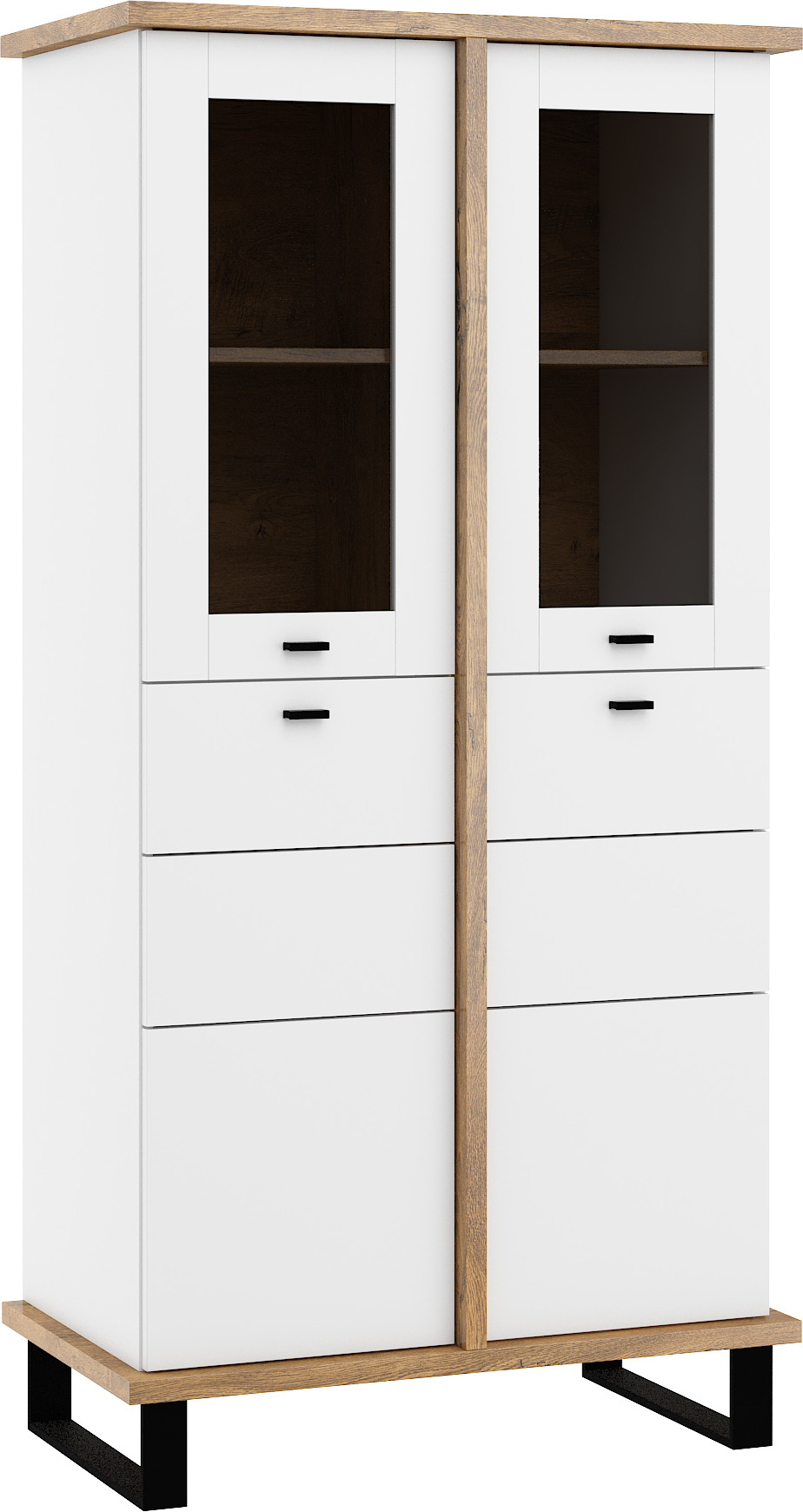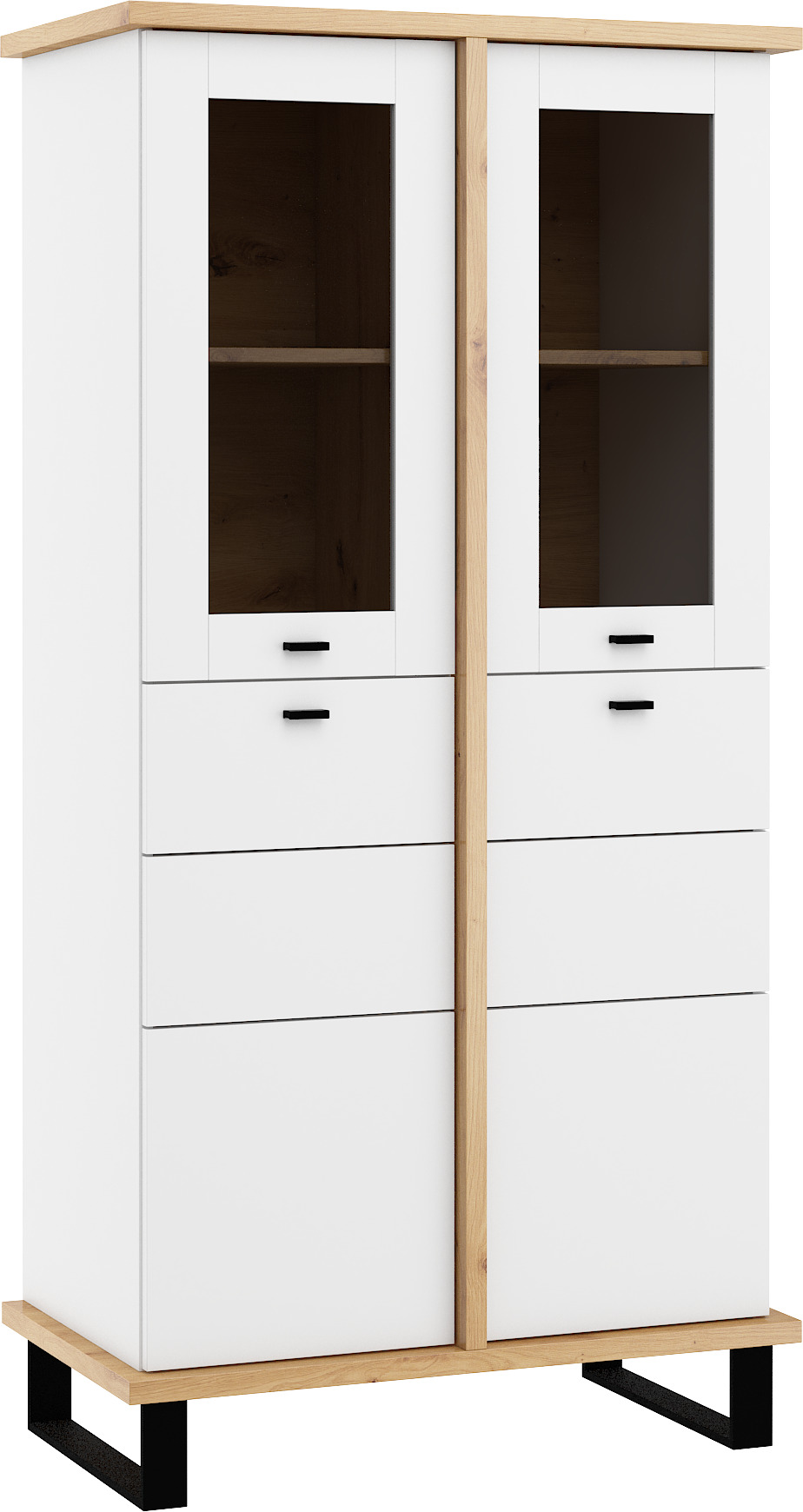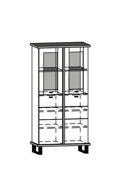 Nízká vitrína Cross 25 disponuje 2 skříňkami s plnými dvířky a 2 skříňkami s prosklenými dvířky. Uvnitř skříněk je celkem 6 polic (viz obrázek v galerii). Police mají max doporučenou nosnost 5kg. Nožky jsou vysoké 12 cm.