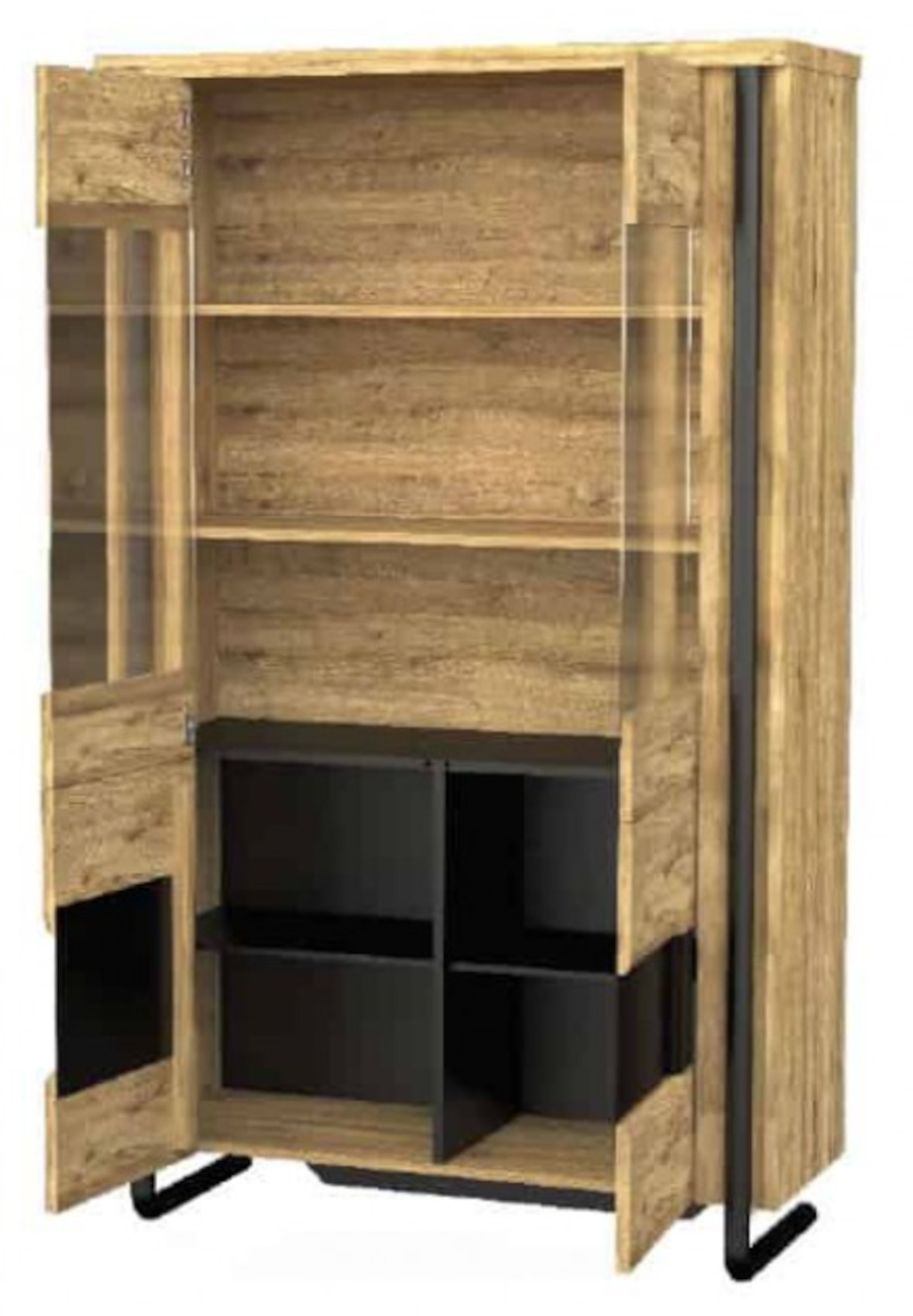 Dvojitá vitrína Omega vás zaujme svým luxusním designem. Přední část je vyrobena z masivního dubového dřeva a korpus z přírodní dubové dýhy. Jedinečnými prvky jsou černé kožené detaily na dvířkách a ohnuté ocelové tyče, které jsou díky práškovému lakování odolné vůči poškození. Kvalitní lakování a moření dodává nábytku přirozený vzhled dřeva a zdůrazňuje strukturu lét. Dvířka mají jednoduchý dotykový systém otevírání - Push to open.