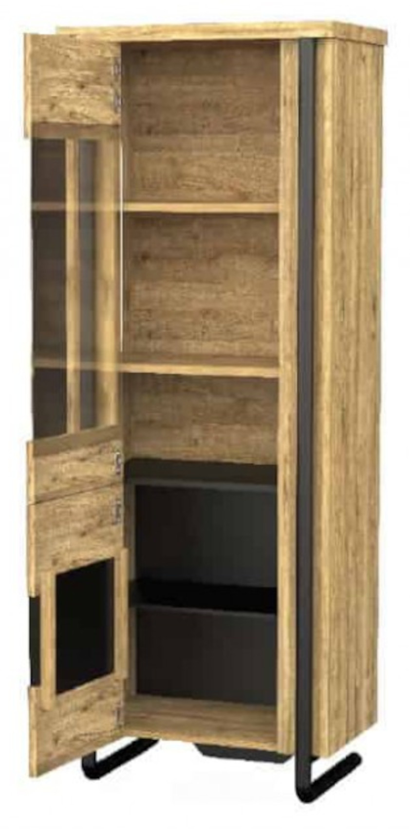 Dvojitá vitrína Omega vás zaujme svým luxusním designem. Přední část je vyrobena z masivního dubového dřeva a korpus z přírodní dubové dýhy. Jedinečnými prvky jsou černé kožené detaily na dvířkách a ohnuté ocelové tyče, které jsou díky práškovému lakování odolné vůči poškození. Kvalitní lakování a moření dodává nábytku přirozený vzhled dřeva a zdůrazňuje strukturu lét. Dvířka mají jednoduchý dotykový systém otevírání - Push to open.