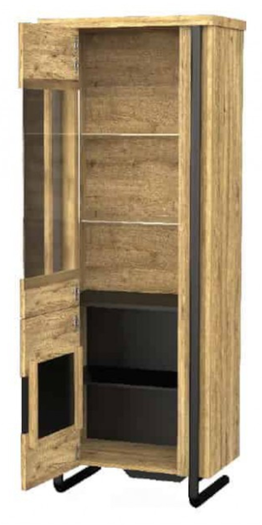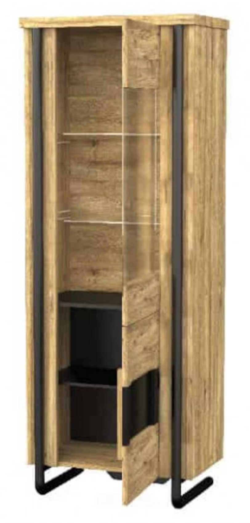 Vitrína Omega vás zaujme svým luxusním designem. Přední část je vyrobena z masivního dubového dřeva a korpus z přírodní dubové dýhy. Jedinečnými prvky jsou černé kožené detaily na dvířkách a ohnuté ocelové tyče, které jsou díky práškovému lakování odolné vůči poškození. Kvalitní lakování a moření dodává nábytku přirozený vzhled dřeva a zdůrazňuje strukturu lét. Dvířka mají jednoduchý dotykový systém otevírání - Push to open.