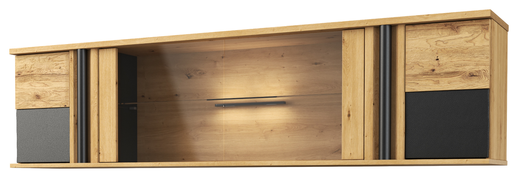 Závěsná vitrína Omega velká 2D2DS vás zaujme svým luxusním designem. Přední část je vyrobena z masivního dubového dřeva a korpus z přírodní dubové dýhy. Jedinečnými prvky jsou černé kožené detaily na dvířkách a ocelové tyče, které jsou díky práškovému lakování odolné vůči poškození. Kvalitní lakování a moření dodává nábytku přirozený vzhled dřeva a zdůrazňuje strukturu lét. Dvířka mají jednoduchý dotykový systém otevírání - Push to open.