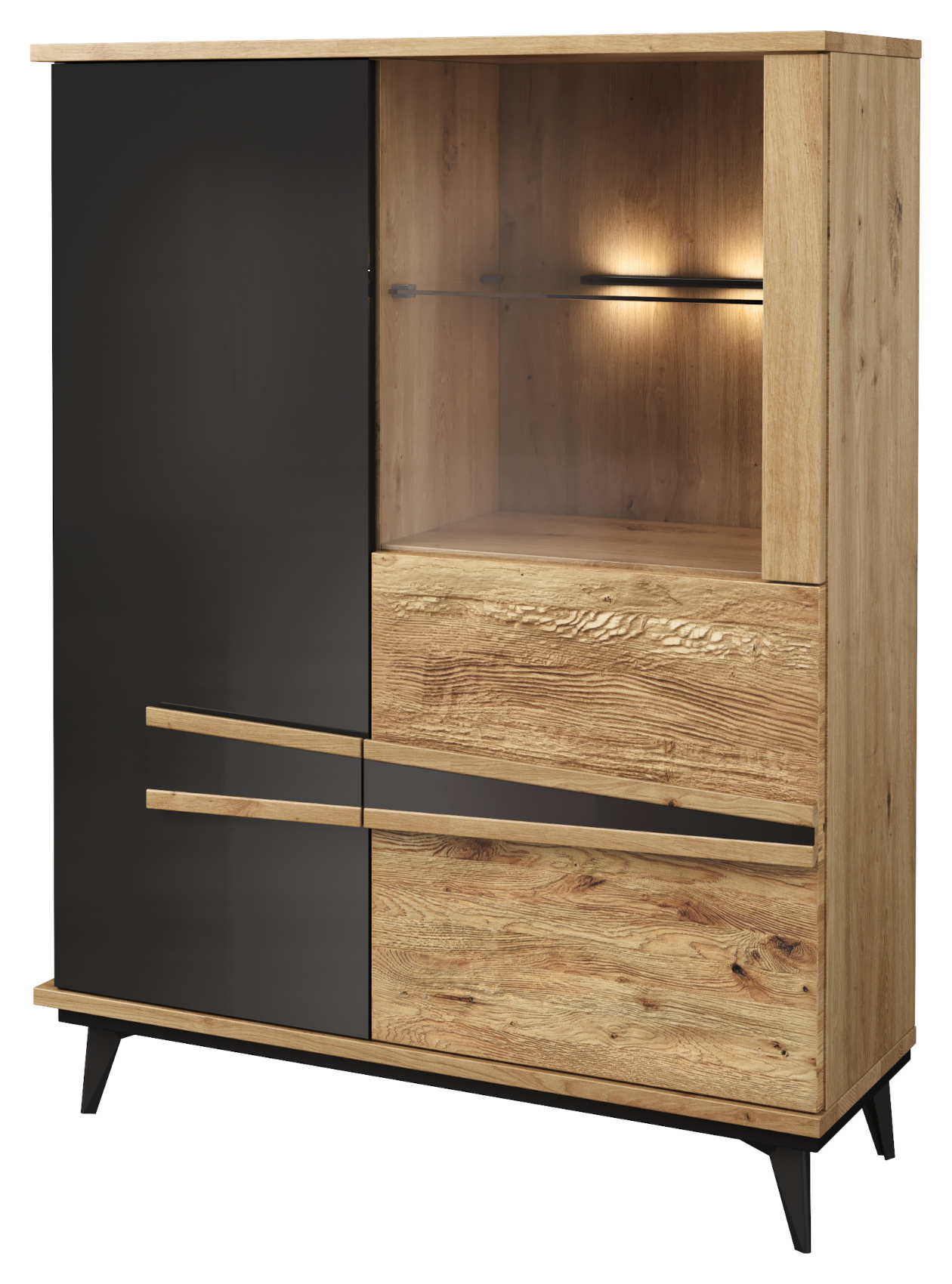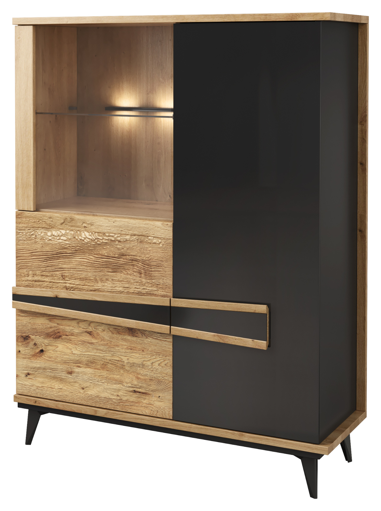 Moderní prosklená skříňka Etna 1DS2D vás zaujme svým industriálním designem. Jedinečným prvkem jsou zvláštní rukojeti na dvířkách, které dodají nábytku nádech elegance. Vitrína je vyrobena z masivního dubového dřeva a přírodní dubové dýhy s černými skleněnými prvky a dvířky. Kvalitní technologie lakování a moření navodí přírodní vzhled dřeva a zvýrazní tak jeho léta. Nábytek stojí na černých kovových nožkách, které provzdušní váš celkový prostor. Dvířka i zásuvky v celém systému mají jednoduchý systém tichého dovírání.