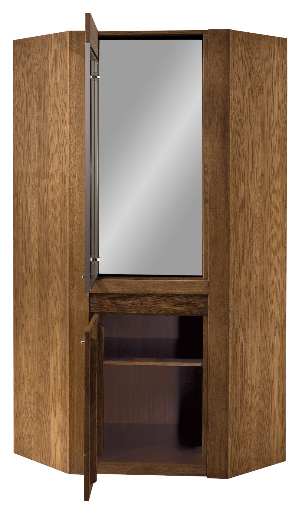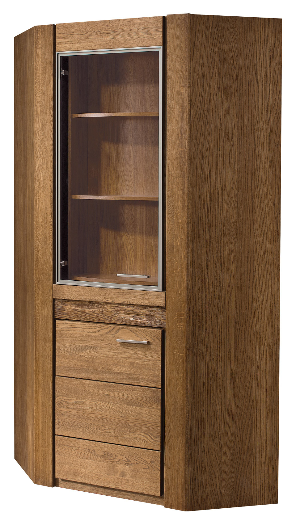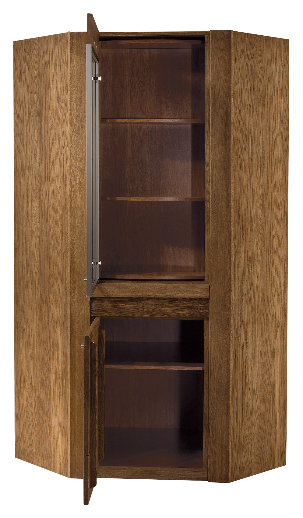 Moderní rohová barová vitrína Velvet 16 vás zaujme svým elegantním a přírodním designem s viditelnou strukturou dřevěných lét. Přední část vitríny je vyrobena z masivního dubového dřeva a korpus z přírodní dubové dýhy. Veškerá dvířka i zásuvky mají kovové úchyty. Nábytek je doplněn LED osvětlením mezi horní a spodní částí.