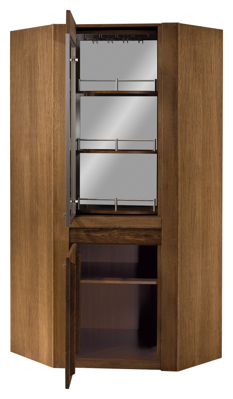 Vnitřní prostor barové vitríny stojí na rotačním kloubu, tudíž můžete pouhým otočením změnit jeho uspořádání. Na jedné straně je policový systém se 2 lakovanými policemi a na druhé straně je vinný bar. V horní části baru jsou závěsy na sklenice a pod nimi jsou 3 police. Ve spodní části skříňky jsou plná dvířka, za kterými je vložena 1 lakovaná police.