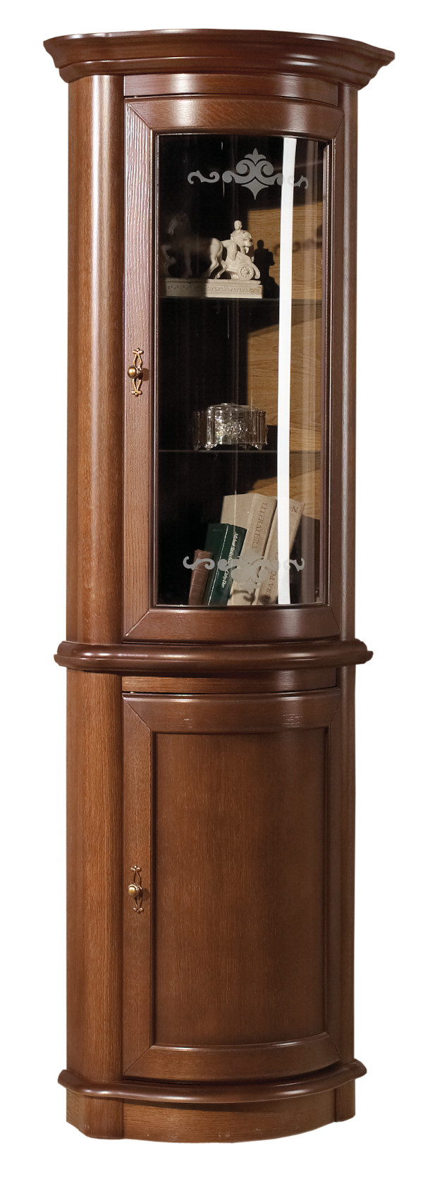 Rohová vitrína Afrodyta 1DS s rohovou komodou Afrodyta 1D vás zaujme svým luxusem a elegancí. Veškerý nábytek z tohoto systému je jedinečný svými zaoblenými dvířky. Vitrína i komoda je vyrobena zpřírodní dubové dýhy. Speciální lakování a moření dodává nábytku design přírodního dřeva a zvýrazňuje tak strukturu lét. Máte možnost si vybrat ze 2 barevných variant se zlatými úchyty.