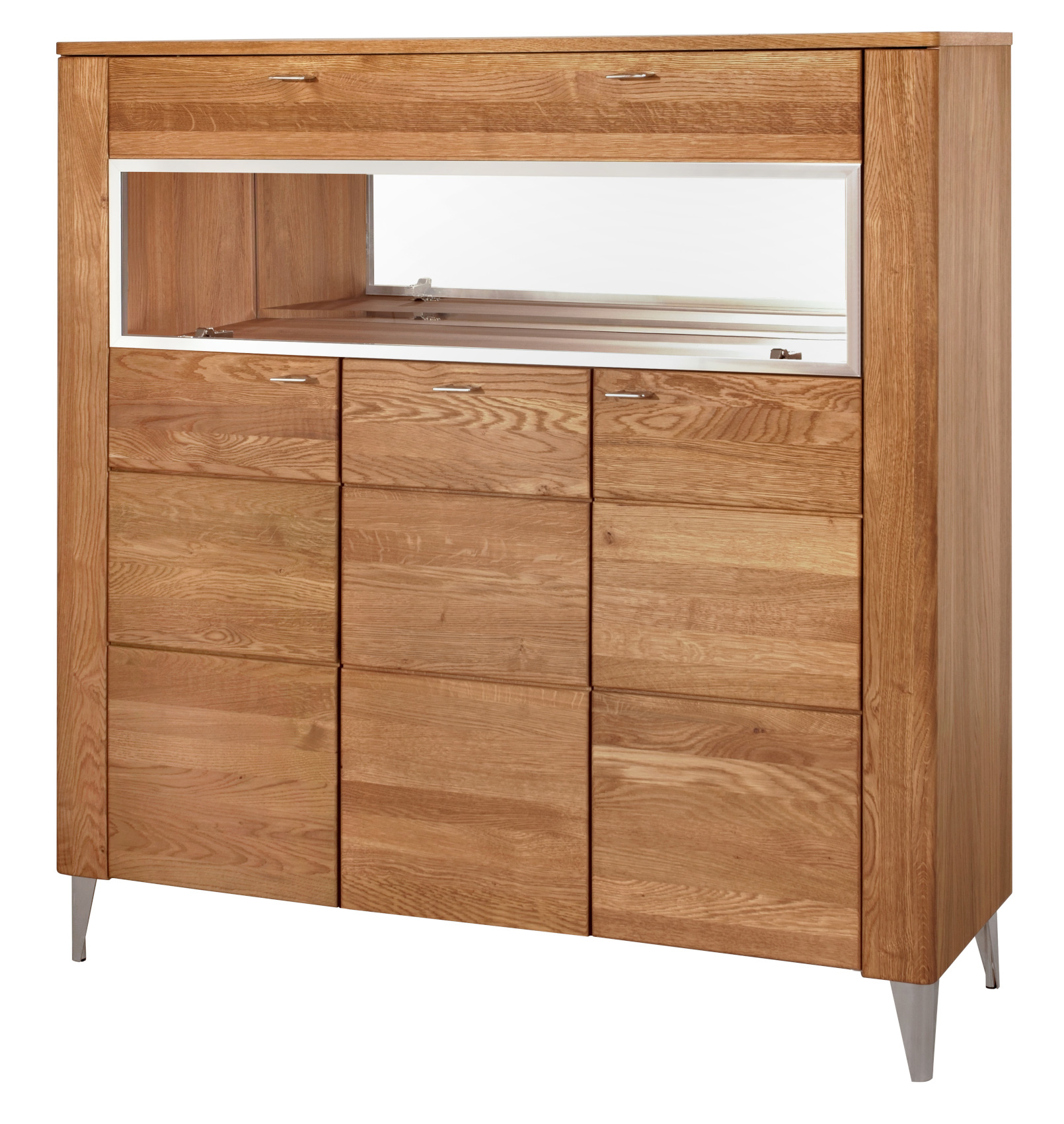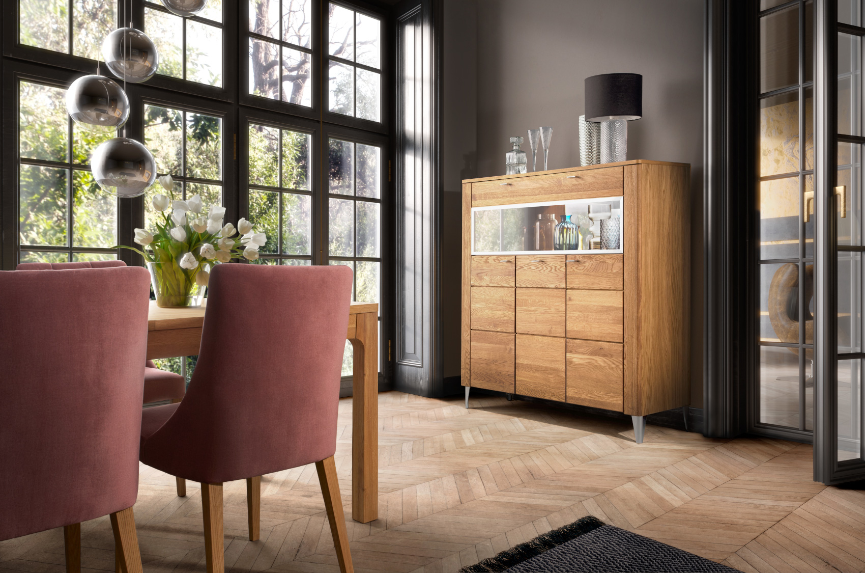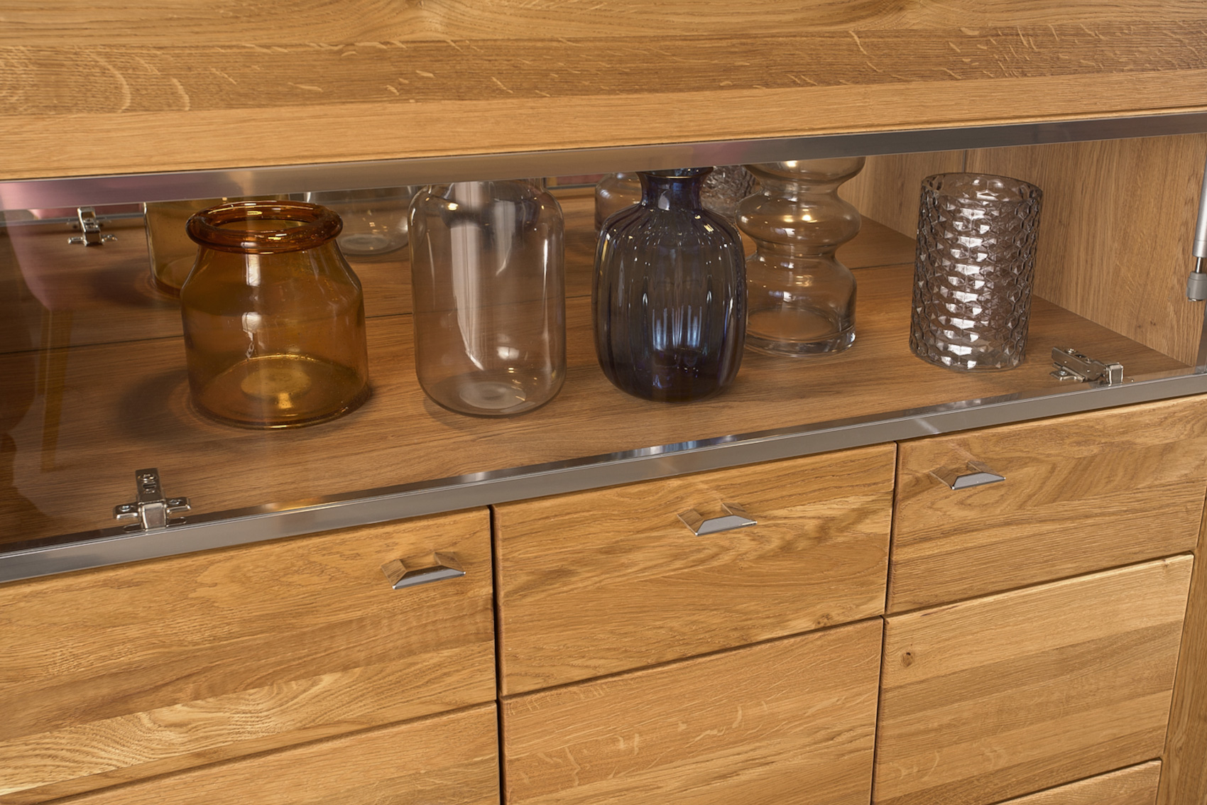 Moderní třídveřová vitrína Latina 48 vás zaujme svým přírodním designem se strukturou dřevěných lét s chromovými detaily. Přední část je vyrobena z masivního dubového dřeva a korpus z přírodní dubové dýhy. Vitrína stojí na chromových nožkách, které provzdušní celý váš interiér a úchyty jsou vyrobeny také z chromu.