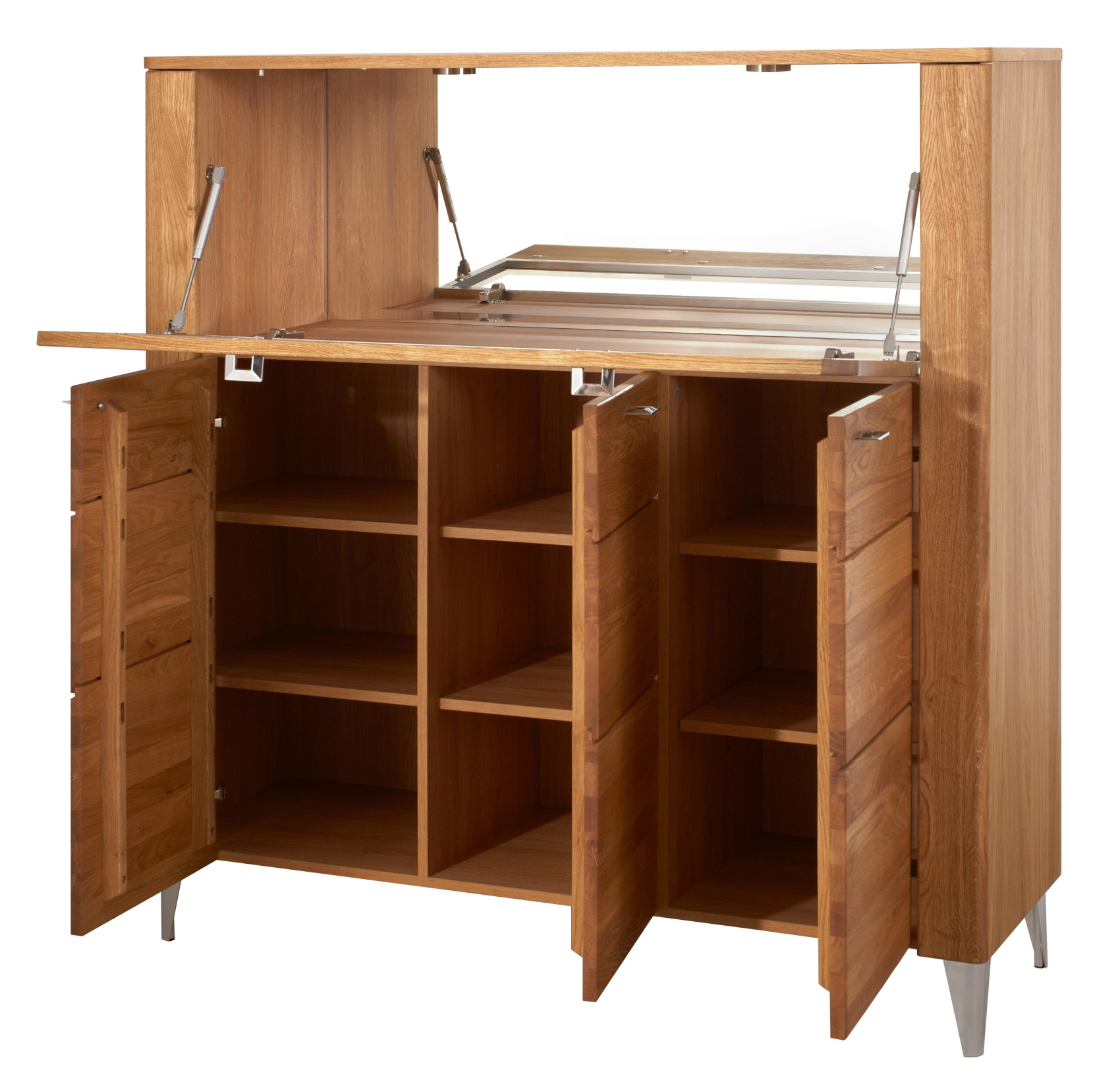 V horní části vitrína jsou částečně prosklená dvířka, která můžete otevřít z obou stran. Pod nimi jsou 3 plná dvířka, za kterými je vloženo 6 lakovaných polic.