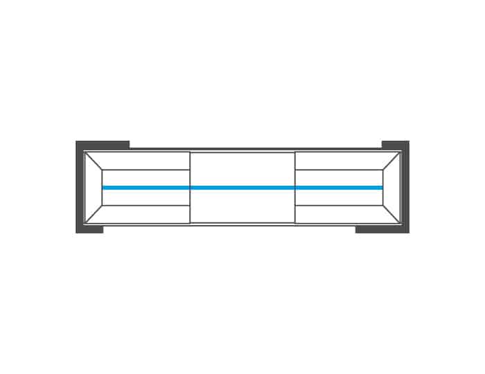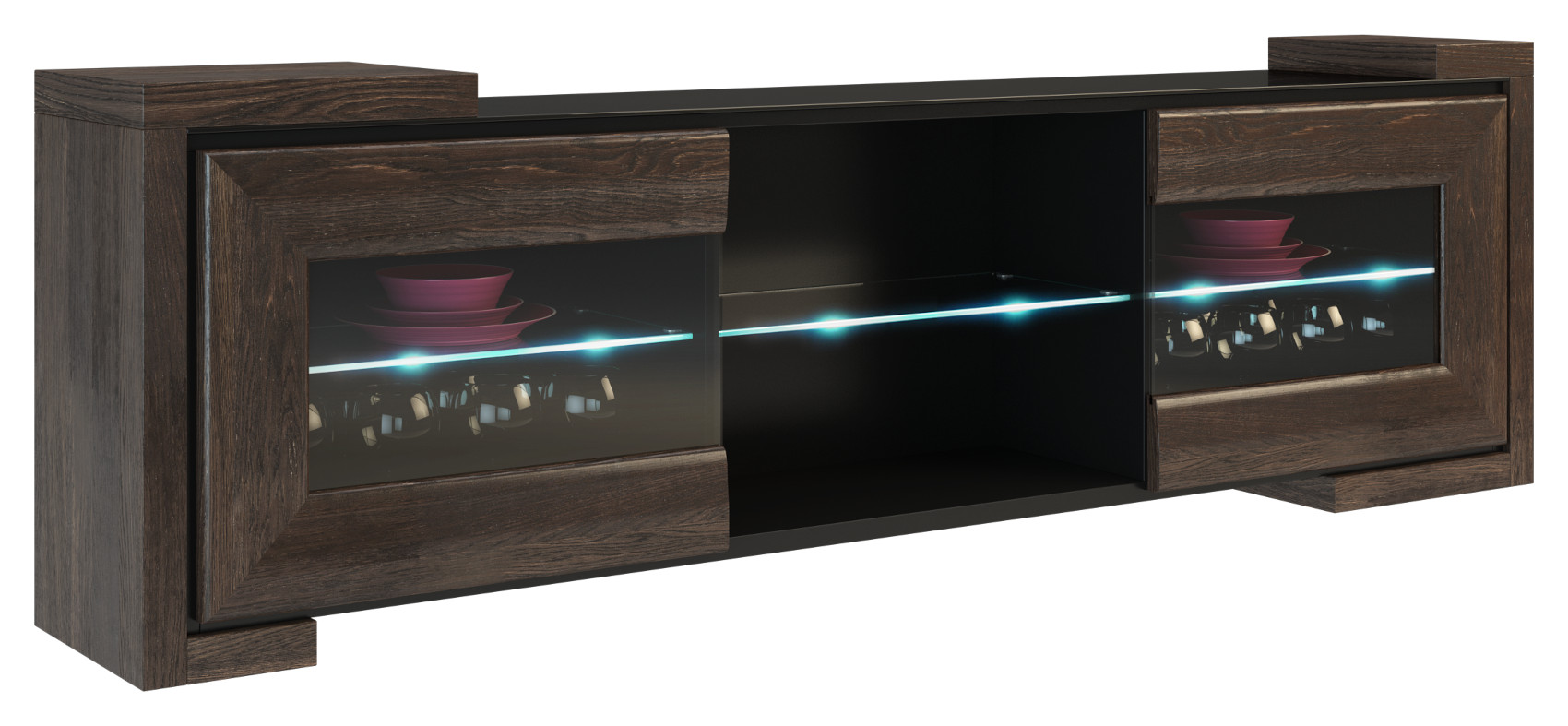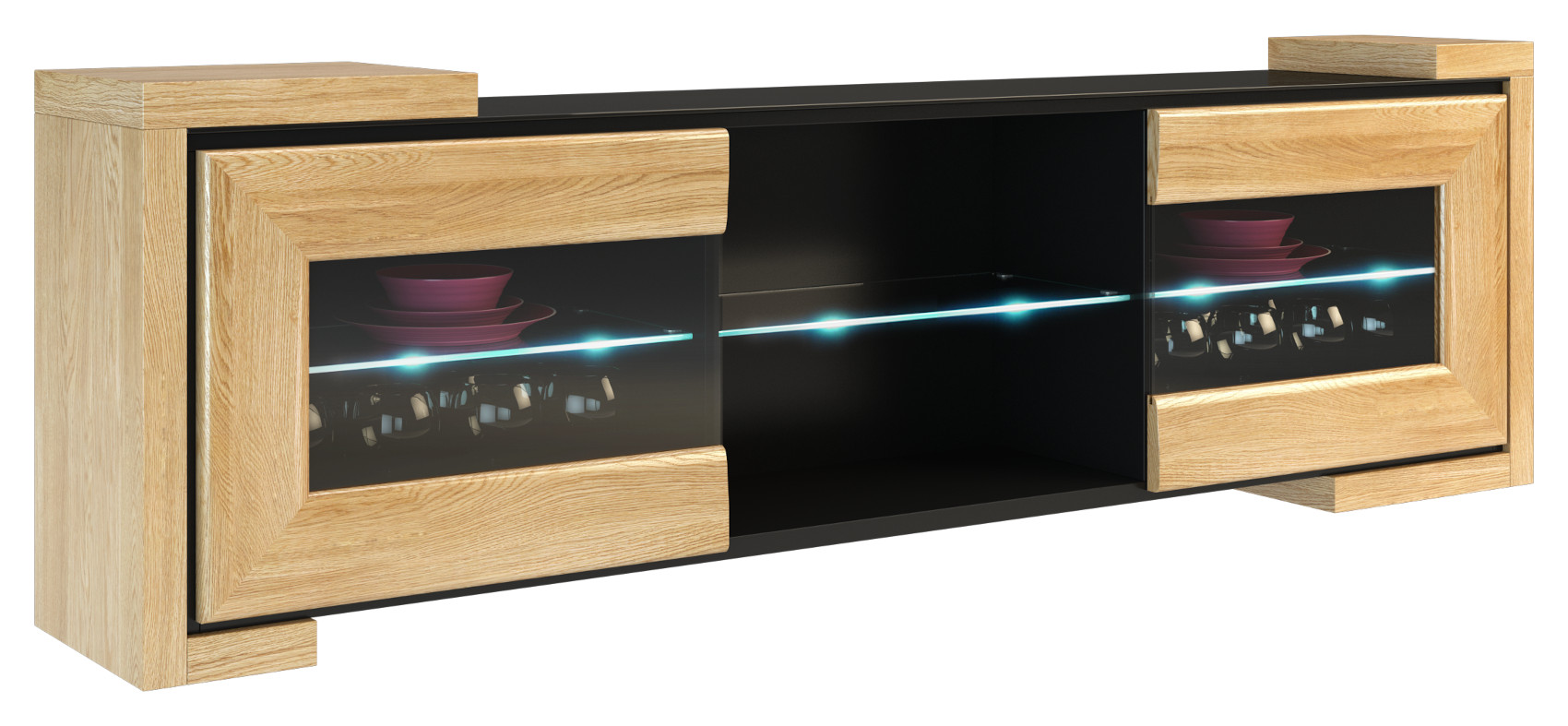 Vitrína má 2 krajní částečně prosklená dvířka sklem Antisol, za kterými jsou vloženy 2 skleněné police. Prostřední část je otevřená s 1 skleněnou policí. Za příplatek si můžete zvolit variantu s LED podsvícením, které dodá nábytku nádech elegance a navodí večerní intimní atmosféru.