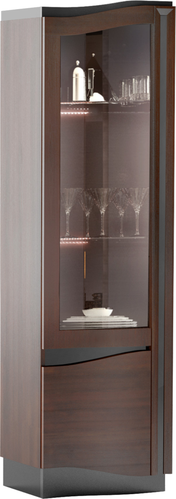 Vitrína Diuna 1DS1D vás zaujme svým moderním a elegantním designem. Jedinečným prvkem jsou dvířka ve tvaru vlny. Je vyrobena z masivu a masivní třešňové dýhy s černými lakovanými detaily. Kvalitní lakování a moření dodává nábytku přirozený vzhled a zvýrazňuje jeho strukturu lét. Systémový nábytek Diuna má jednouchý dotykový systém otevírání dvířek - Push to open.
