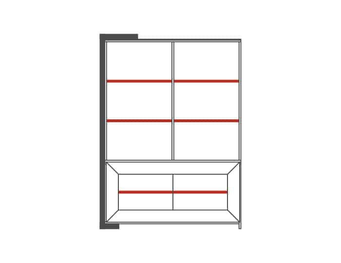 Vitrína má otevřenou horní část, které jsou vloženy 4 lakované police. Ve spodní části jsou 2 dvířka se 2 lakovanými policemi.