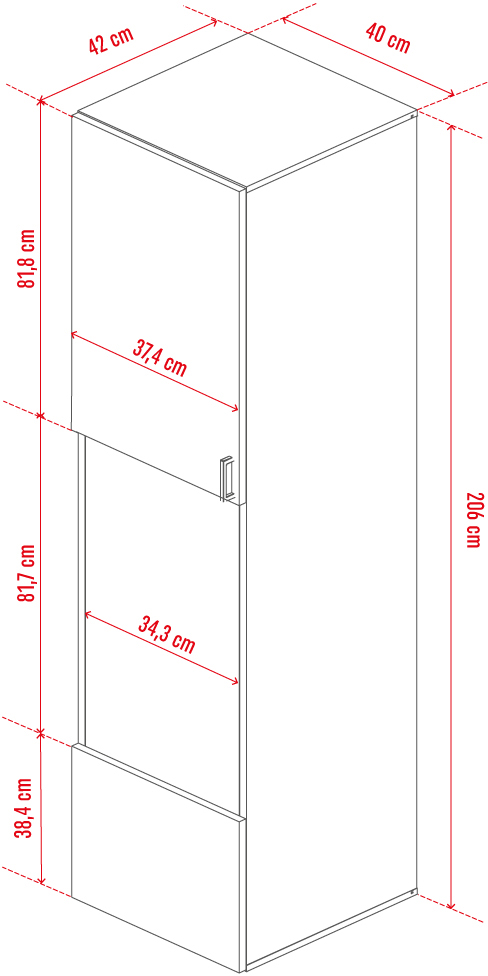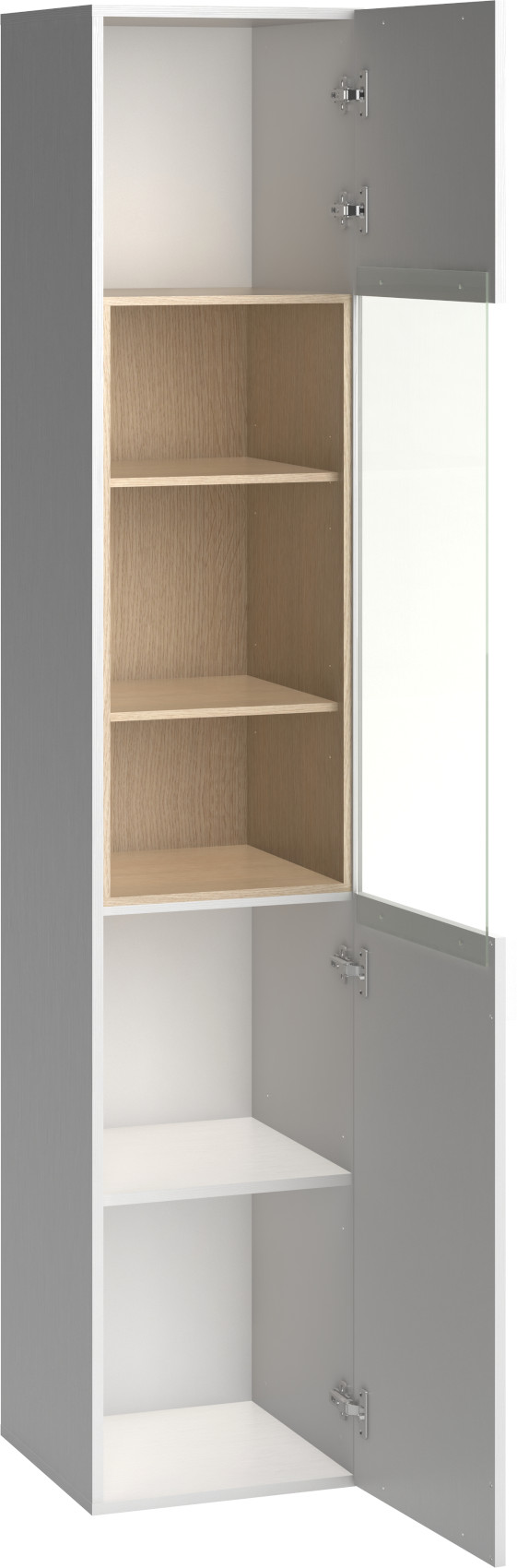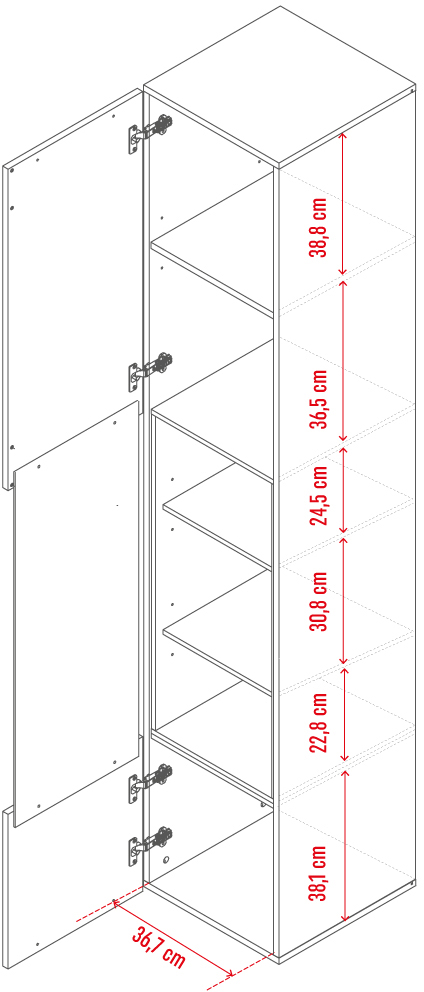 Za částečně prosklenými dvířky z tvrzeného skla jsou vloženy police s libovolně nastavitelnou výškou.