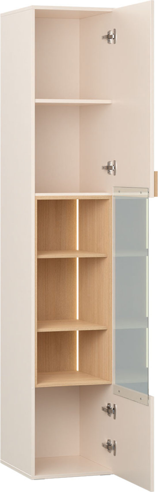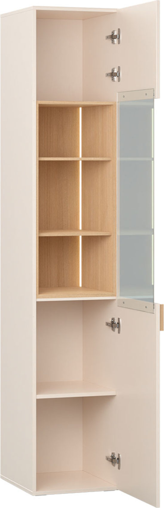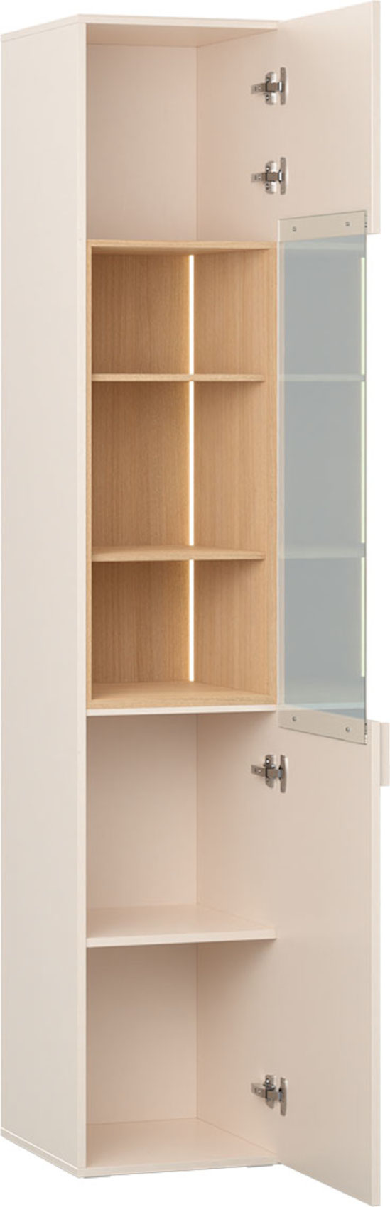 Součástí vitríny v pískově béžovém odstínu je LED osvětlení, které dodá nábytku nádech elegance a luxusu.