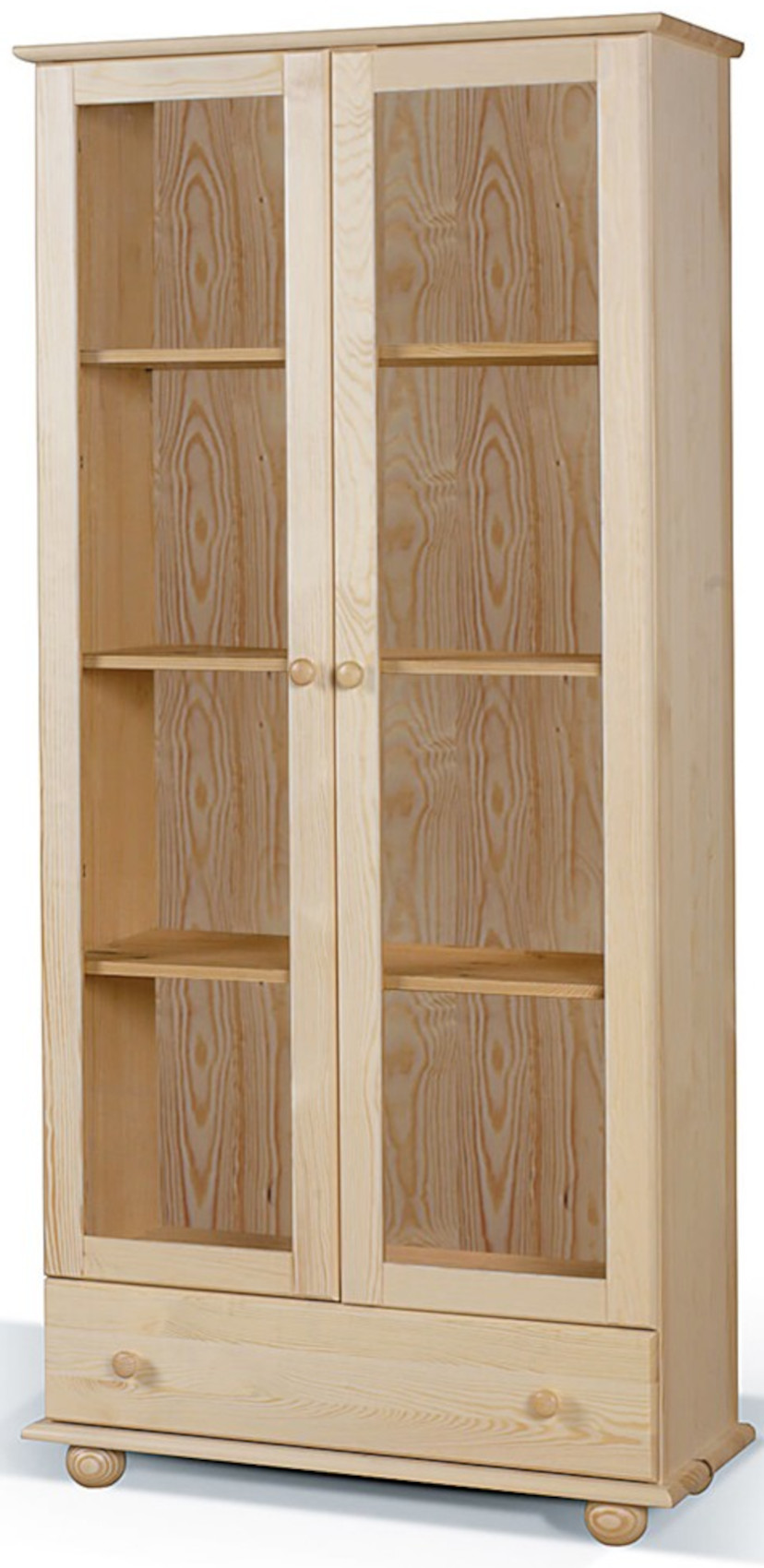 Velká vitrína Classic vás zaujme svým jednoduchým přírodním designem s viditelnou strukturou dřevěných lét. Je vyrobena z masivního borovicového dřeva, které vám zaručí kvalitu, odolnost a stabilitu. Součástí jsou dřevěné úchyty ve tvaru knoflíku. Jedinečným prvkem jsou nízké kulaté nožky, které dodají nábytku nádech elegance a provzdušní váš interiér. Na výběr máte z několika variant odstínů moření.