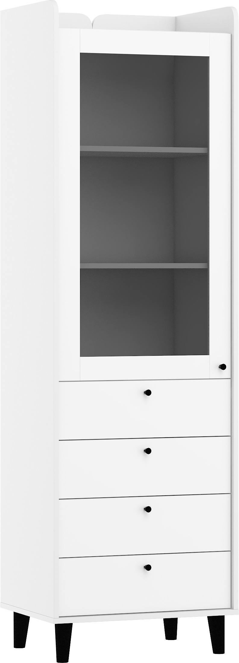 Vysoká vitrína Dolce se skvěle hodí do obýváků i jídelen, je vybavená také 4 praktickými zásuvkami. Skleněná výplň dvířek má lehký kouřový odstín - grafit.