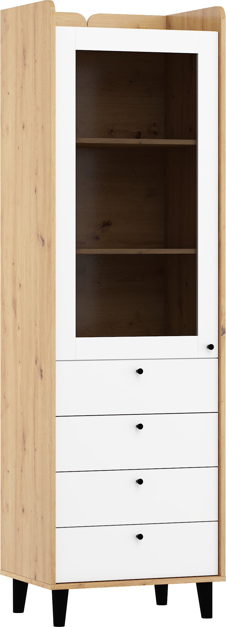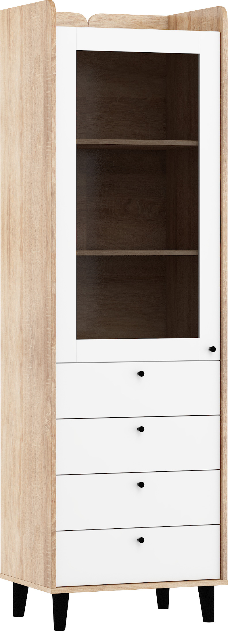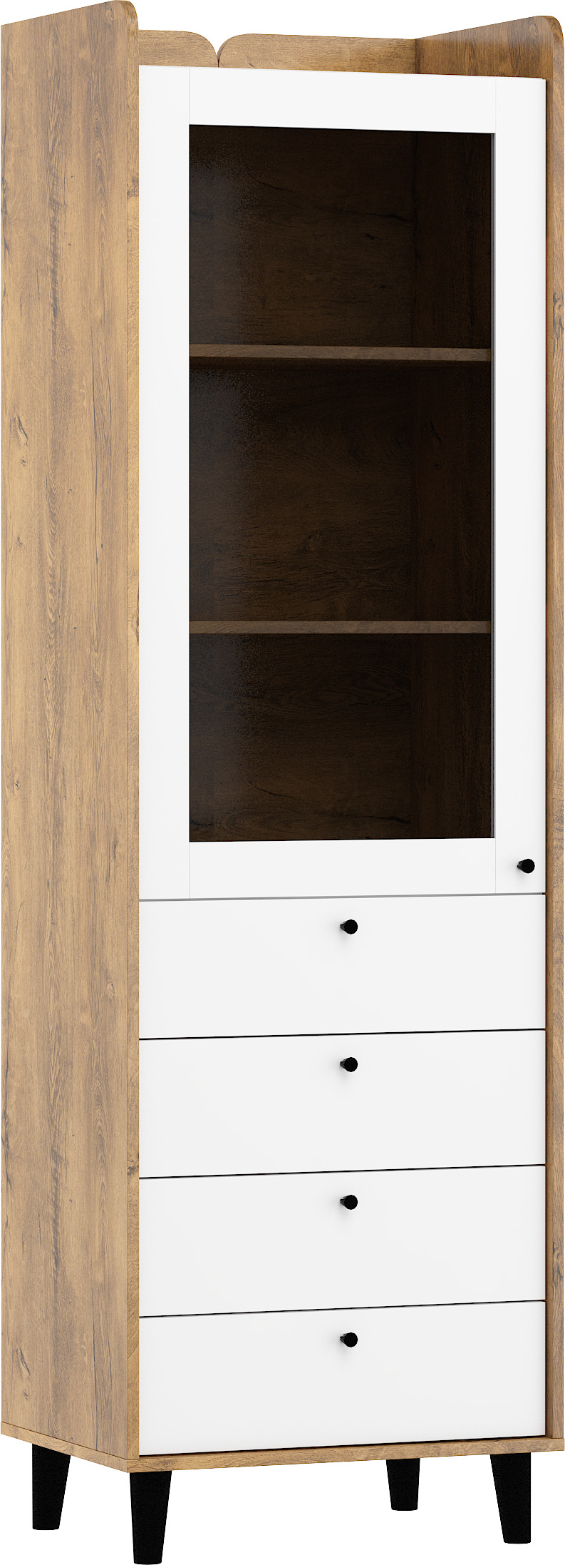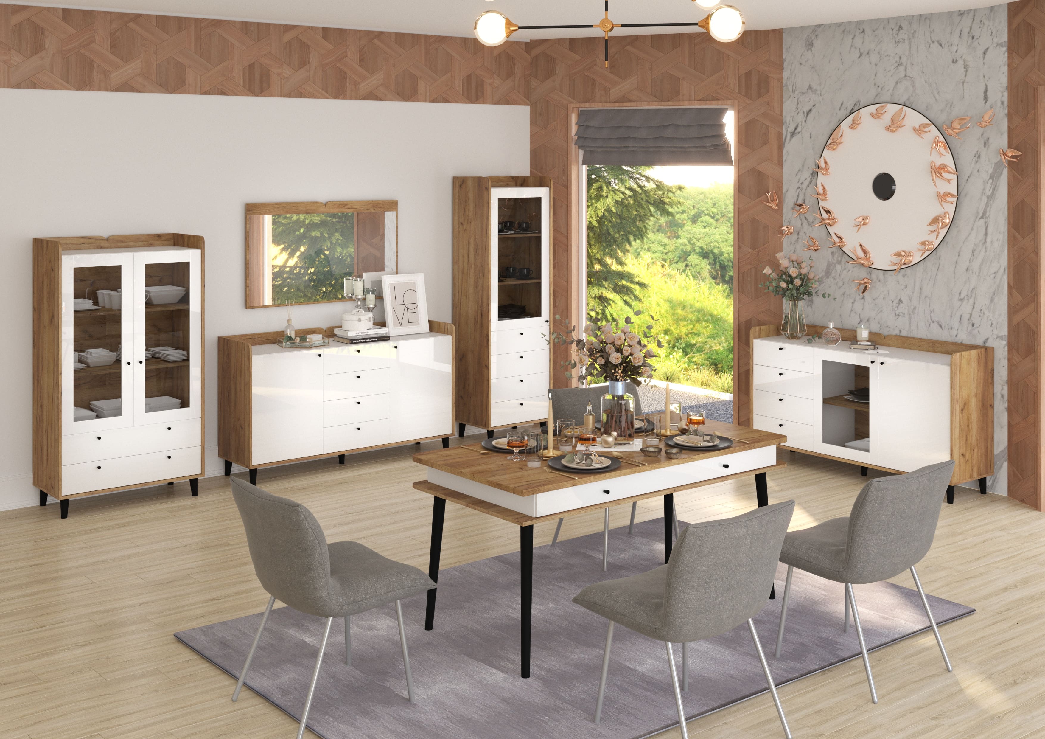 Výrazným prvkem jsou černé dřevěné nožky různých výšek, které dodají celé kolekci originální vzhled. A nejen to, vyšší nožky jsou také praktické při uklízení. Vitríny jsou vybavené kouřovými skly, které ještě více zdůrazní originální vzhled systému. Černou barvu mají i úchyty a spolu s bílým leskem na předních plochách skvěle doplňují dřevodekory reflektující moderní trendy v bydlení. S kolekcí Dolce nemůžete šlápnout vedle!