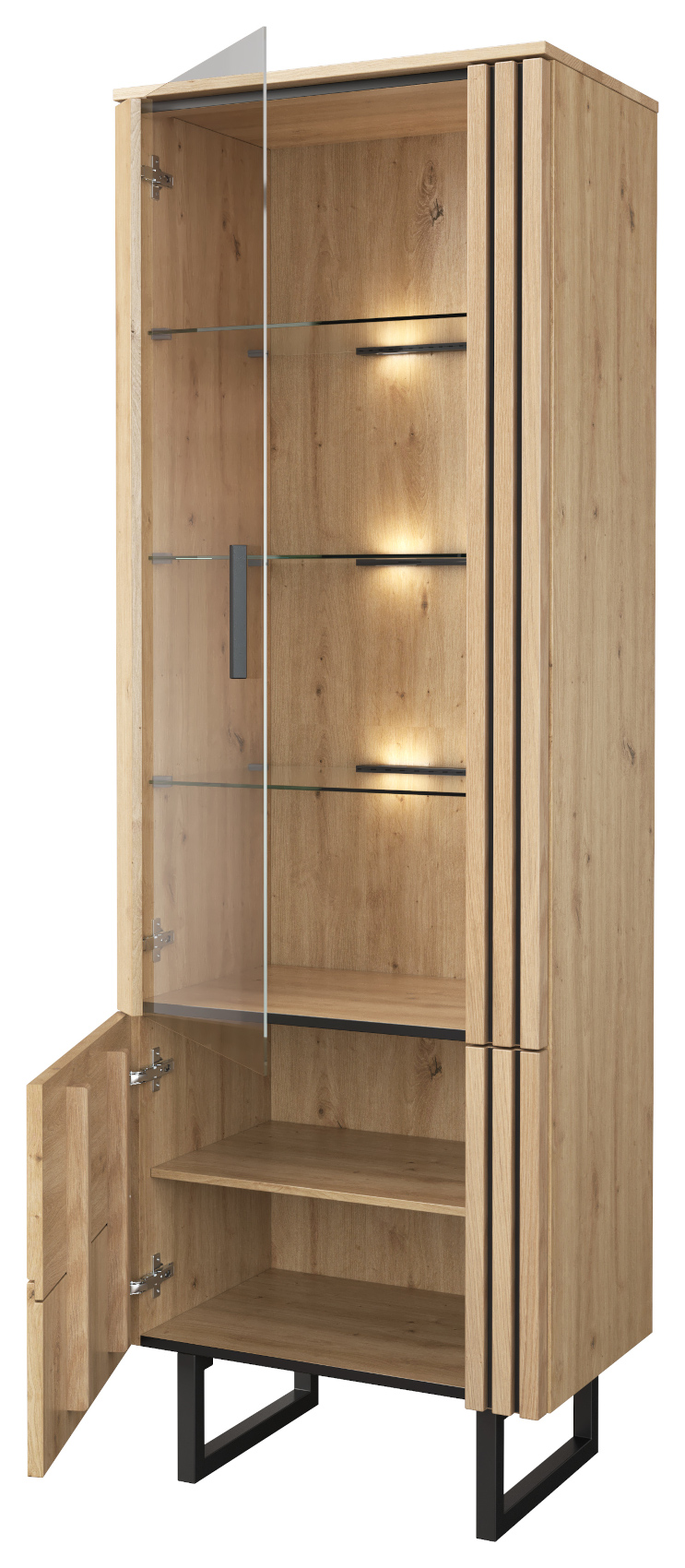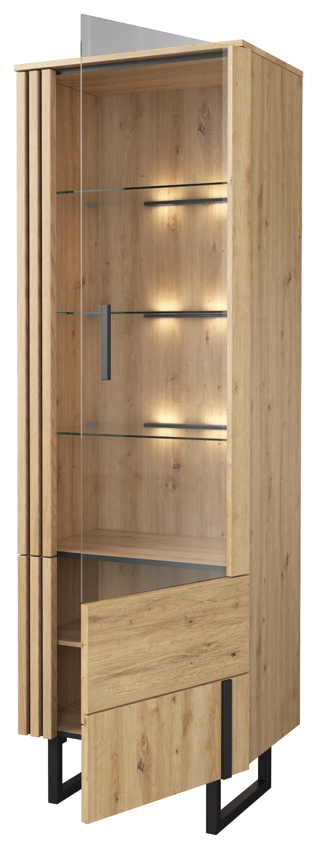 Moderní vitrína Gintaro 1DS1D vás zaujme svým jedinečným designem. Černé lamely na přední straně nábytku dodají nádech elegance a kovové a neobyčejně tvarované nohy provzdušní váš interiér. Vitrína je vyrobena z masivního dubového dřeva a přírodní dubové dýhy. Prosklené části vitrín jsou z hnědého skla Antisol. Kvalitní technologie lakování a moření navodí přírodní vzhled dřeva a zvýrazní tak jeho léta. Dvířka i zásuvky v celém systému mají tichý jednoduchý dotykový systém otevírání a zavírání - Push to open.