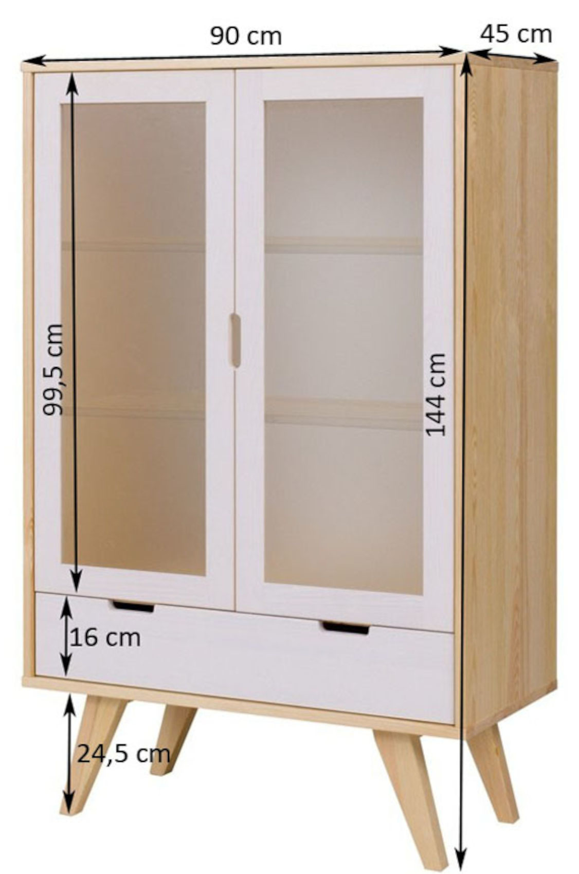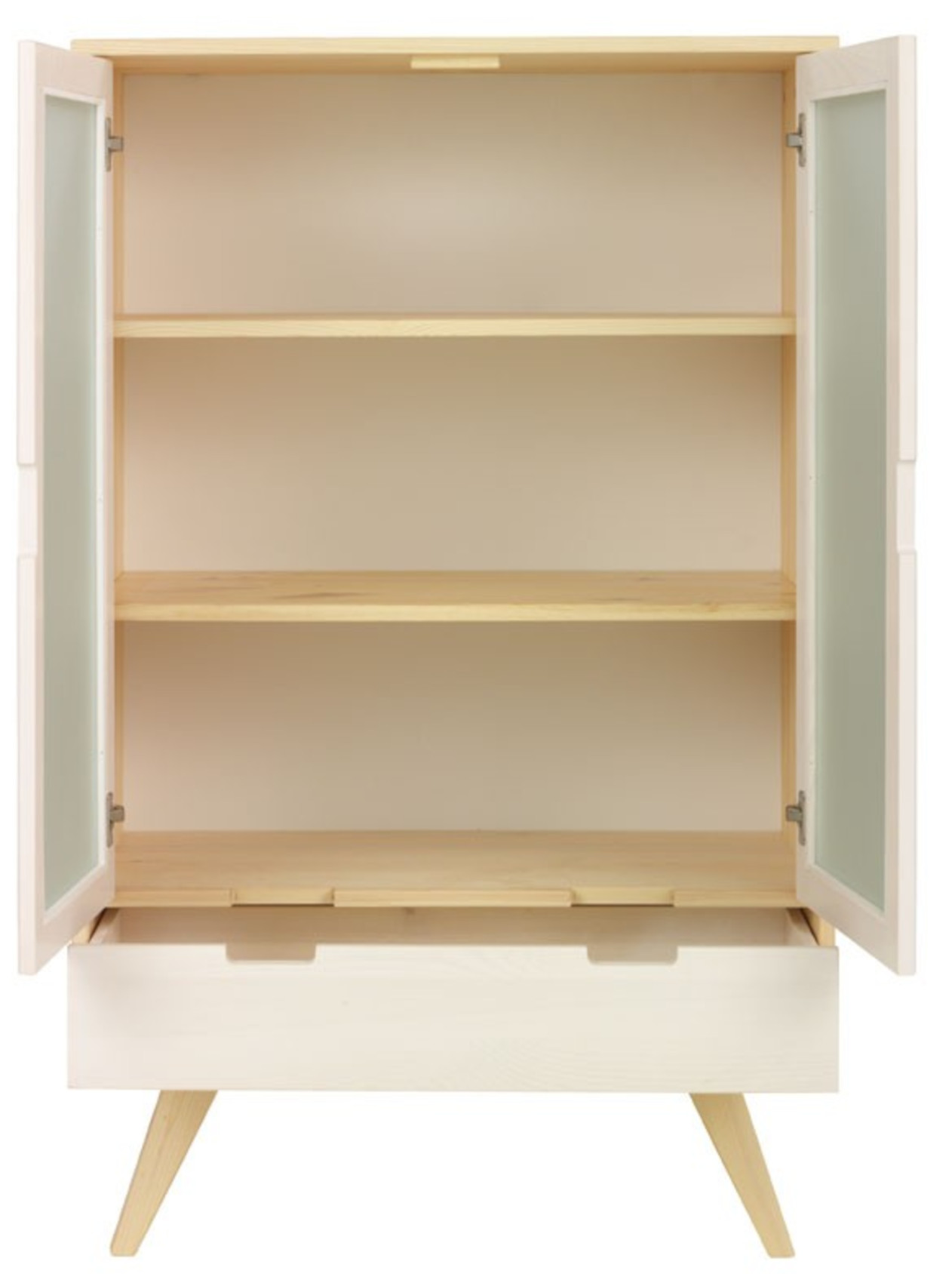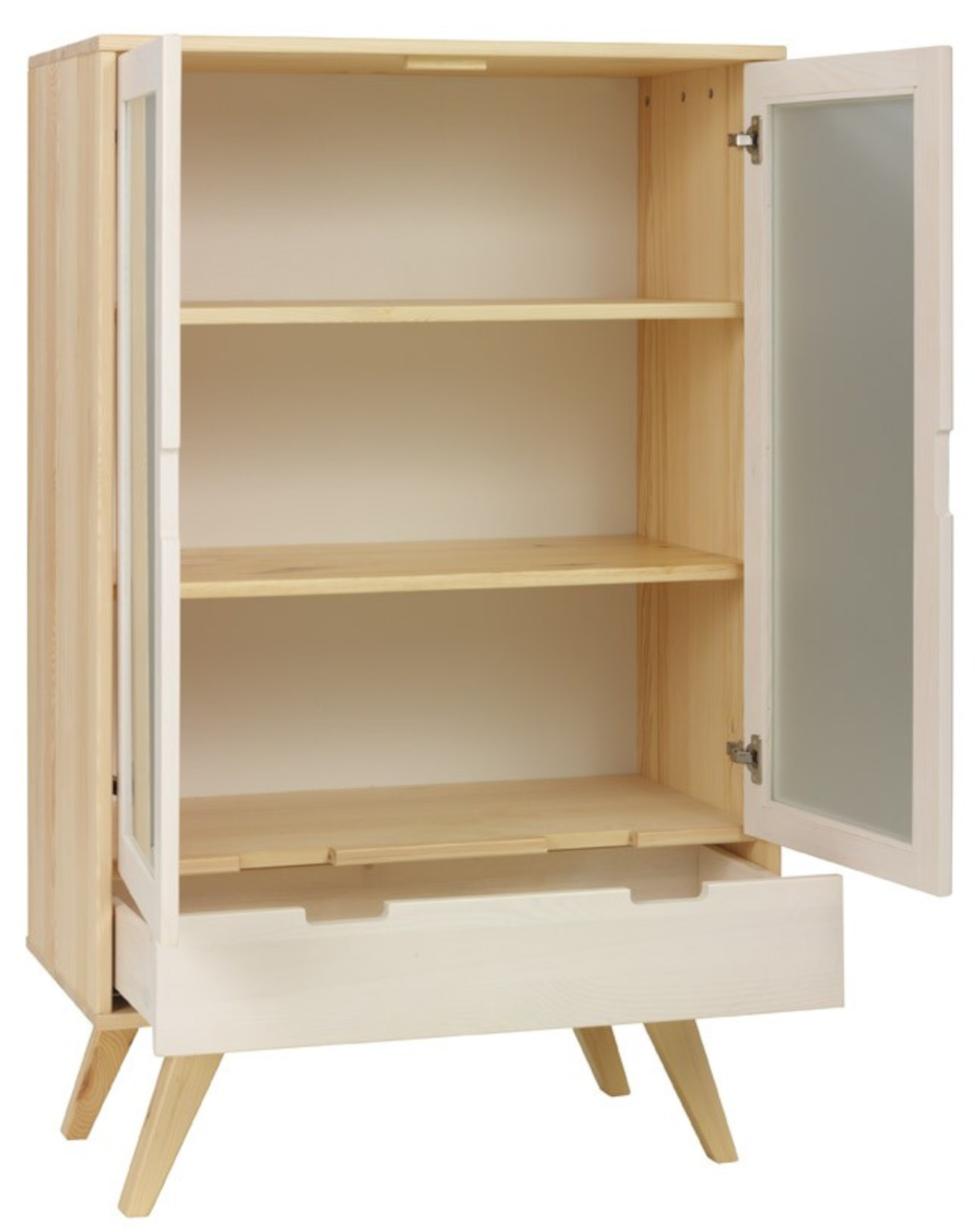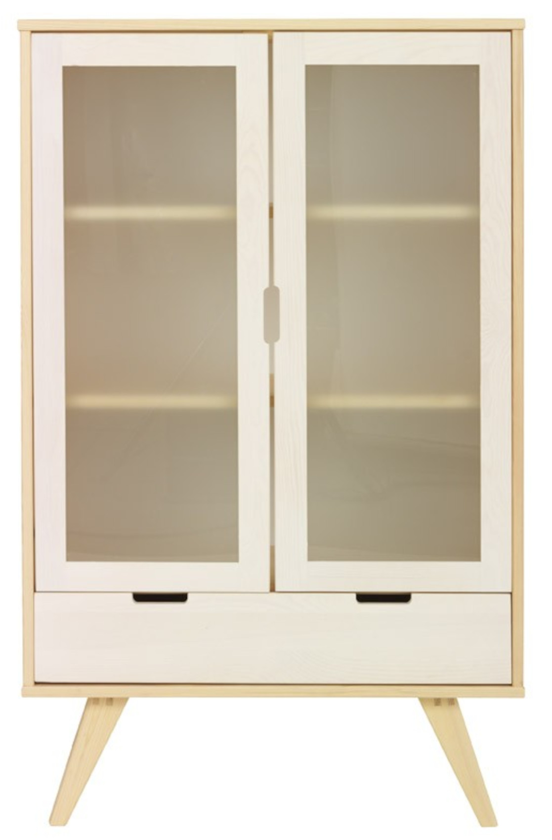 Za částečně prosklenými dvířky jsou vloženy 2 lakované police k vystavení vašich oblíbených knih, dekorací nebo porcelánu. Ve spodní části je zásuvka na kovových pojezdech se zabudovaným systémem tichého dovírání.