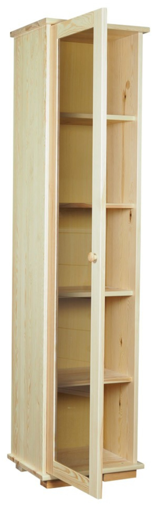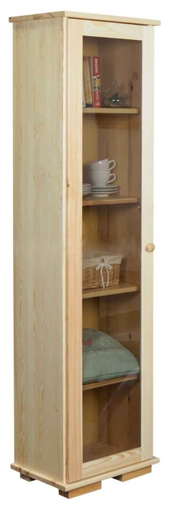 Vitrína Modern I vás zaujme svým jednoduchým přírodním designem s viditelnou strukturou dřevěných lét. Je vyrobena z masivního borovicového dřeva, které vám zaručí kvalitu, odolnost a stabilitu. Součástí jsou dřevěné úchyty ve tvaru knoflíku. Vitrína stojí na nízkých nožkách, které dodají nádech elegance. Na výběr máte z několika odstínu moření dřeva.