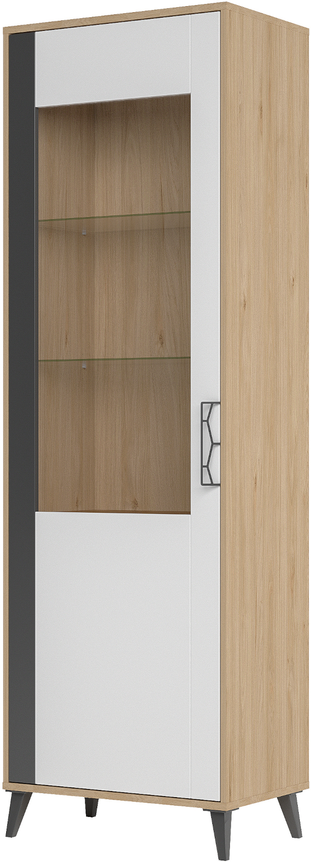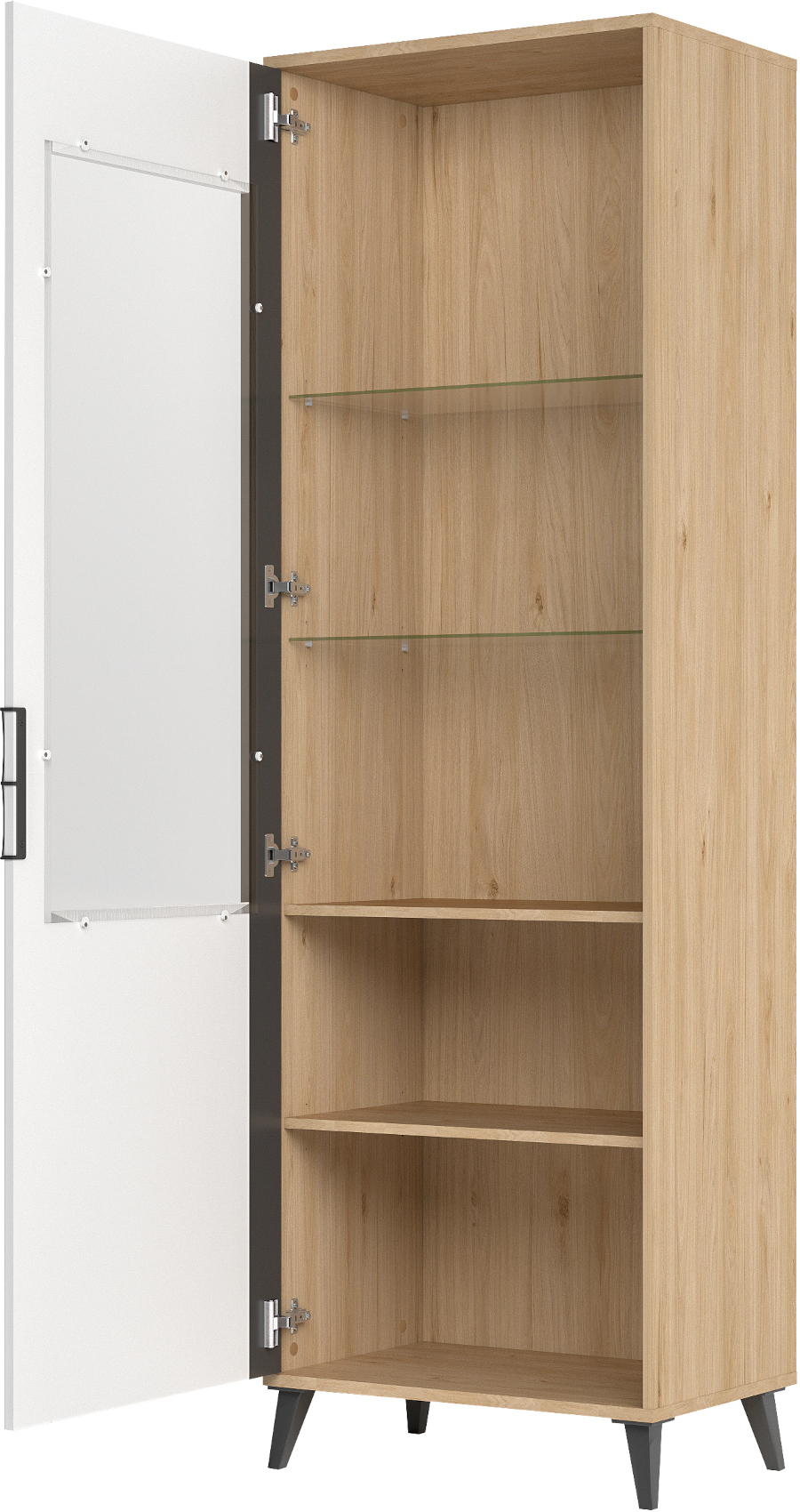 Moderní vitrína Moet 10 v levém provedení vás zaujme svým prostým, ale zároveň luxusním designem. Je vyrobena z kvalitního odolného lamina potaženého speciální fólií, která vám navodí dojem přírodního masivního dřeva. Úzké nožky dodají nábytku nádech retro stylu a provzdušní váš celkový prostor. Jedinečným prvkem jsou speciálně tvarované úchyty vyrobené z oceli v šedém odstínu. Dvířka mají zabudovaný systém tichého dovírání.