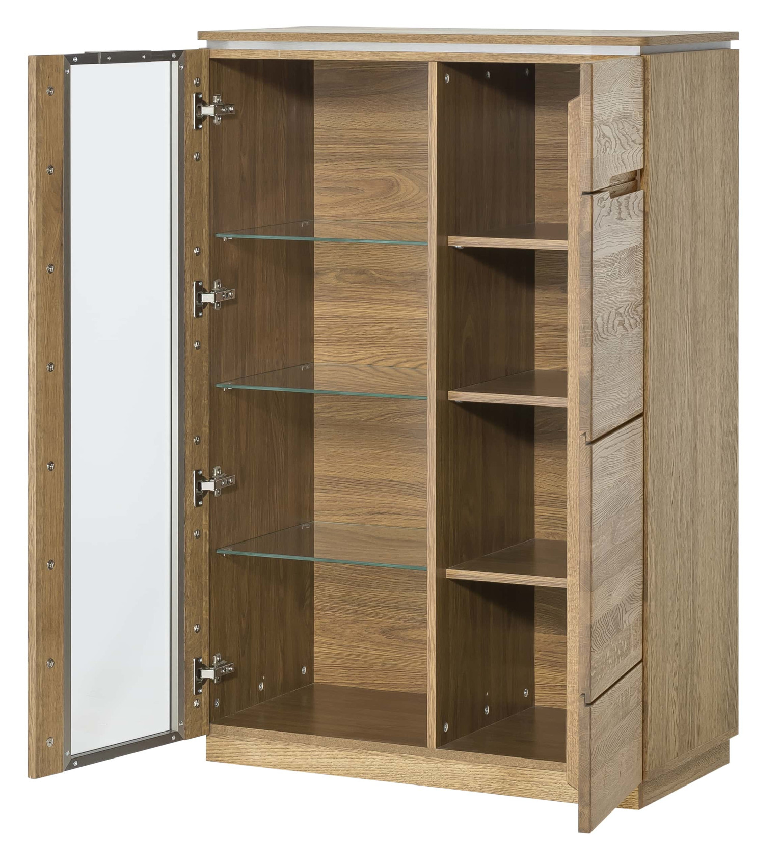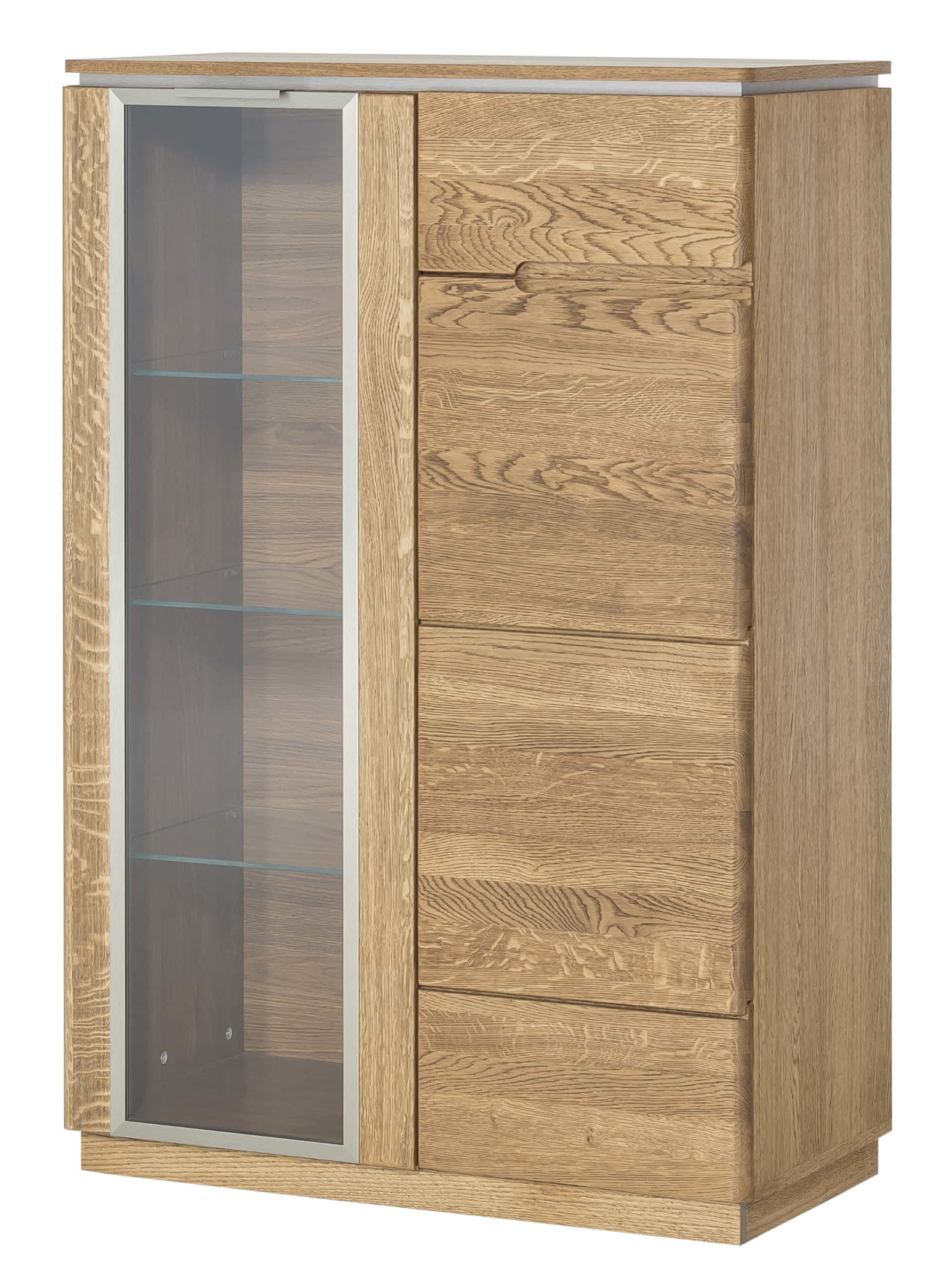 Moderní vitrína Montenegro 15 vás zaujme svým elegantní designem. Přední část je vyrobena z masivního dubové dřeva a korpus z přírodní dubové dýhy. Jedinečným prvkem celého systému jsou kovové detaily pod horní deskou. Dvířka mají kovové úchytky.