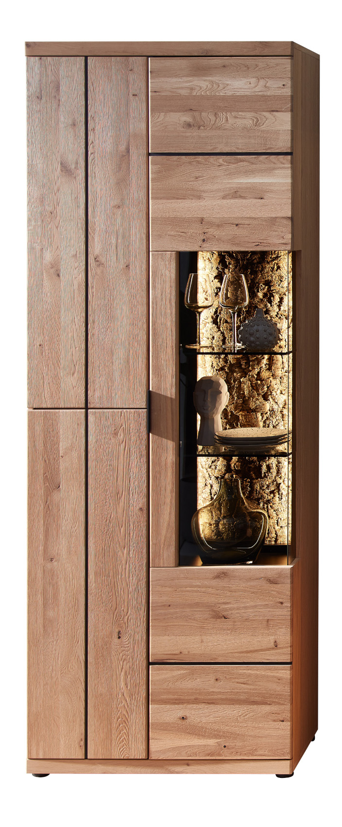 Dvoudveřová moderní vitrína Napoli 01 vás zaujme svým přírodním designem s viditelnou strukturou dřevěných lét. Přední dvířka, se systémem tichého dovírání, jsou vyrobena z masivního dubového dřeva a korpus z přírodní dubové dýhy, která je potažena fólií. Součástí vitríny jsou kovové černě lakované úchyty, které dodají nábytku nádech elegance. Nábytek stojí na velmi nízkých černých plastových nožkách.