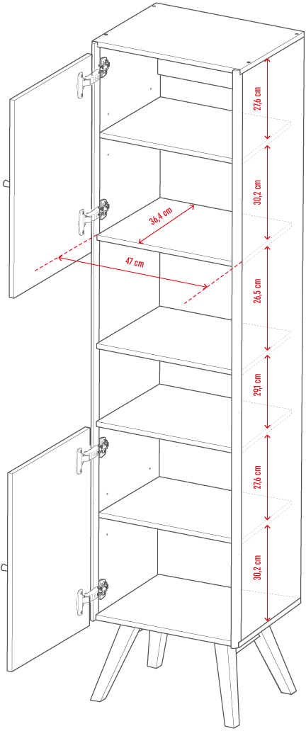 Vitrína má 2 dvířka, za kterými jsou vloženy 2 lakované police s libovolně nastavitelnou výškou. Uprostřed je 1 lakovaná police, kterou můžete doplnit LED osvětlením, které dodá nábytku nádech luxusu. LED osvětlení je zahrnuto v ceně.