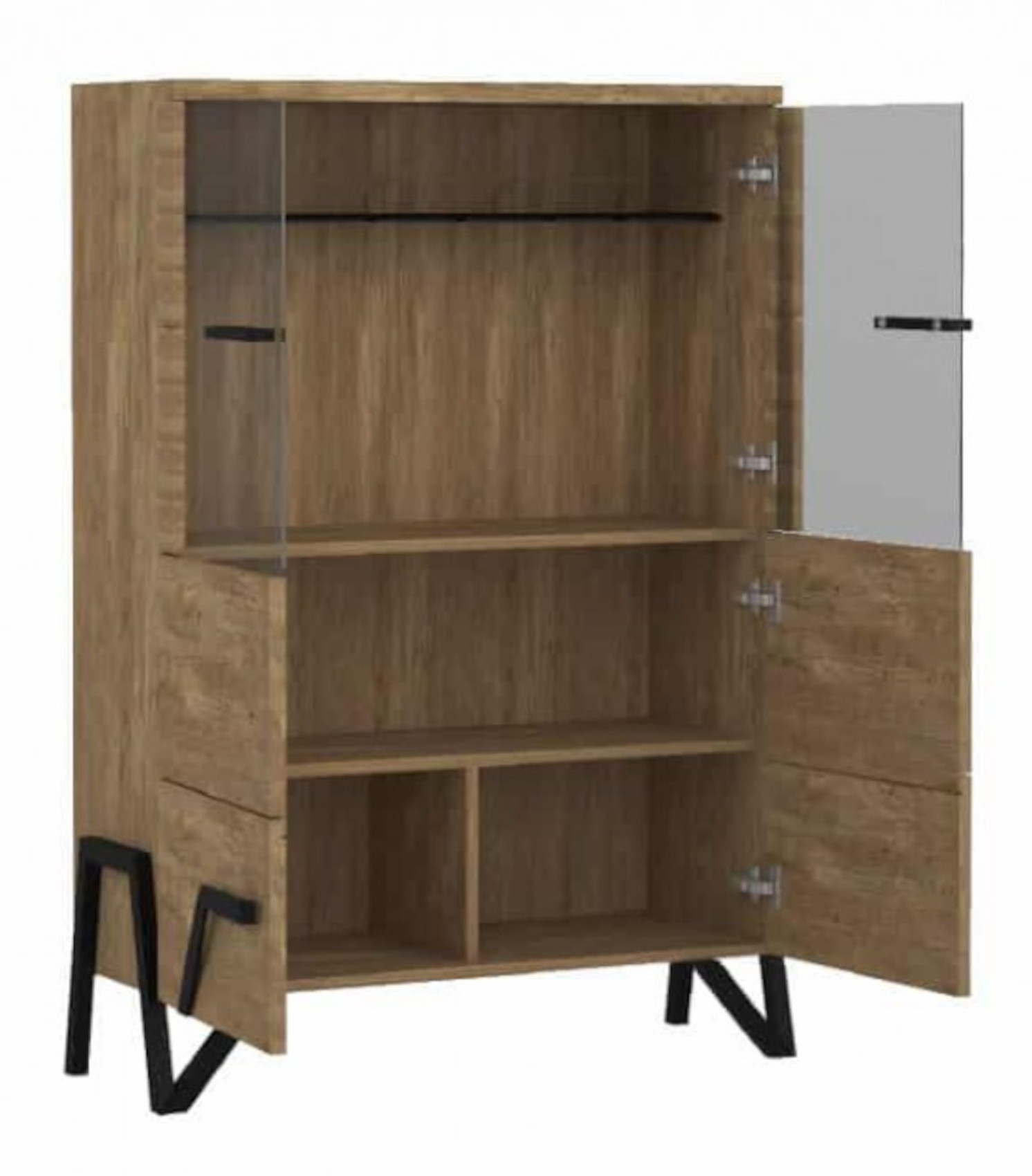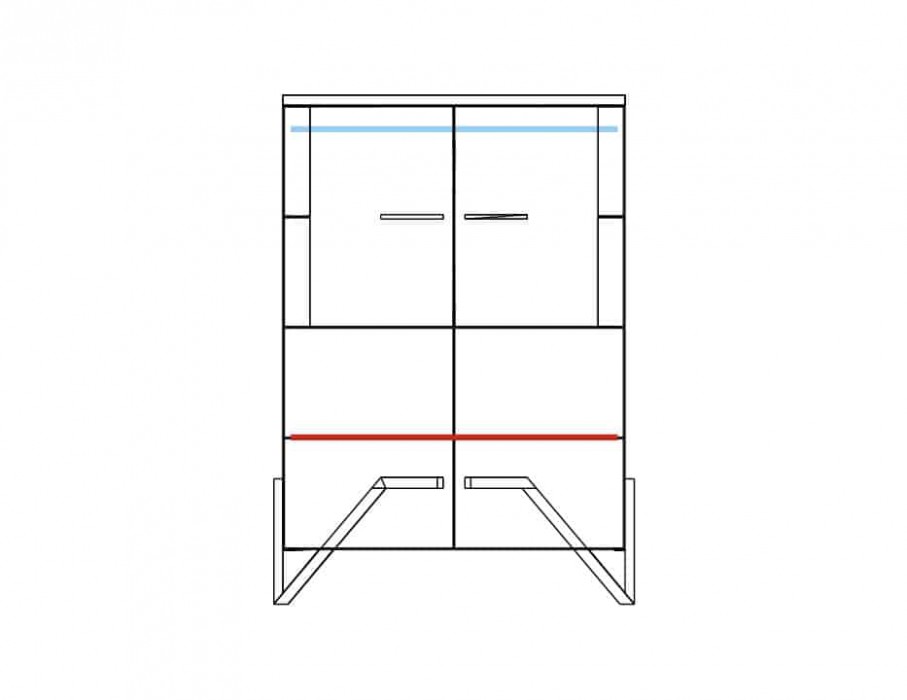 Vitrína má 2 částečně prosklená dvířka. V horní části je vložena 1 skleněná police s LED podsvícením, které dodá nábytku nádech luxusu, elegance a navodí večerní intimní atmosféru. Ve spodní části je 1 lakovaná police.
