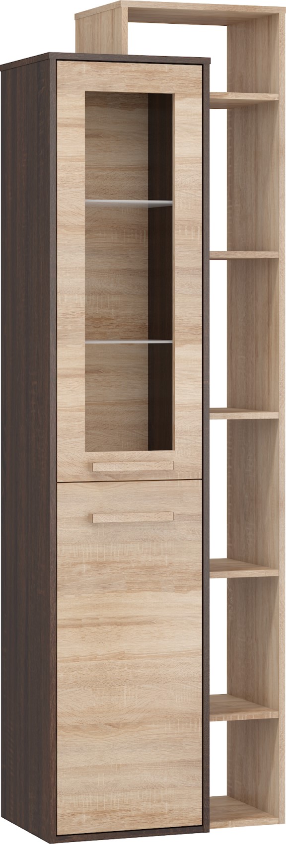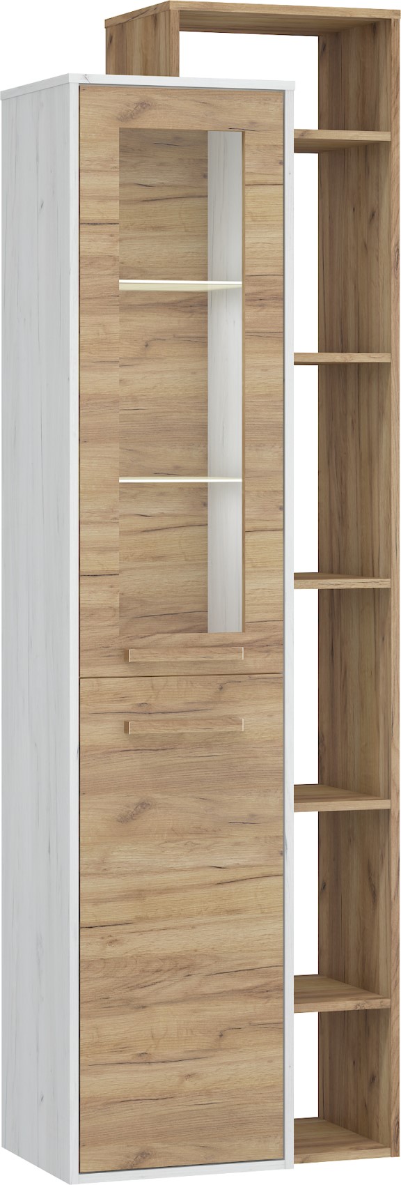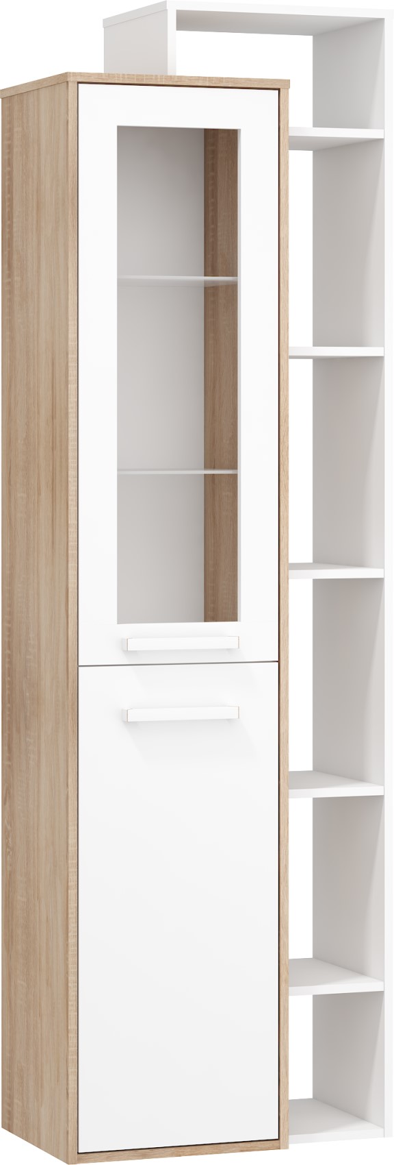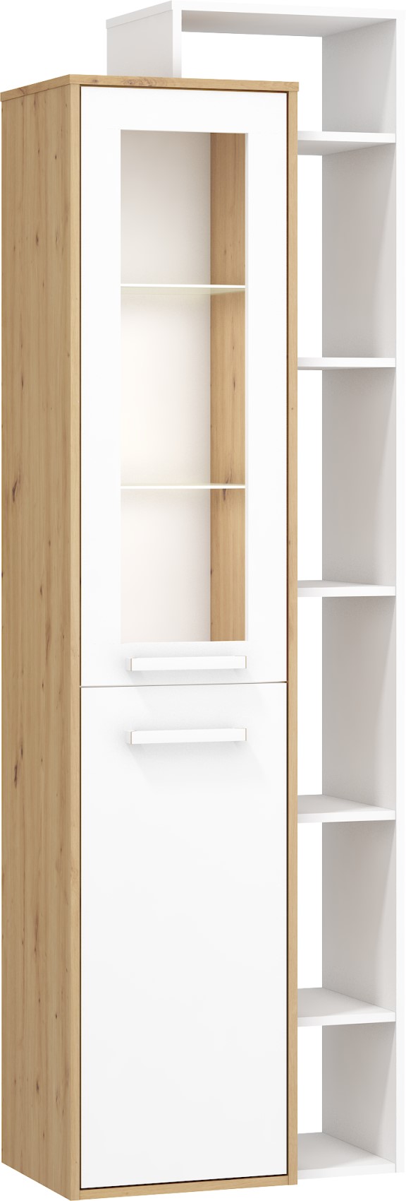 Součástí jsou 1 částečně prosklená dvířka. Ve vnitřním prostoru jsou vloženy 2 skleněné police a 1 lakovaná police.