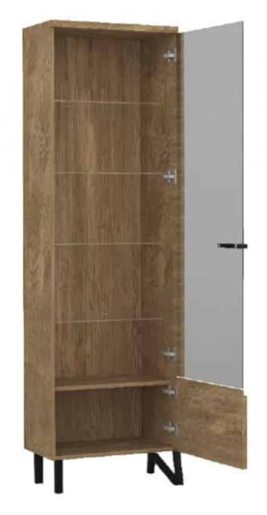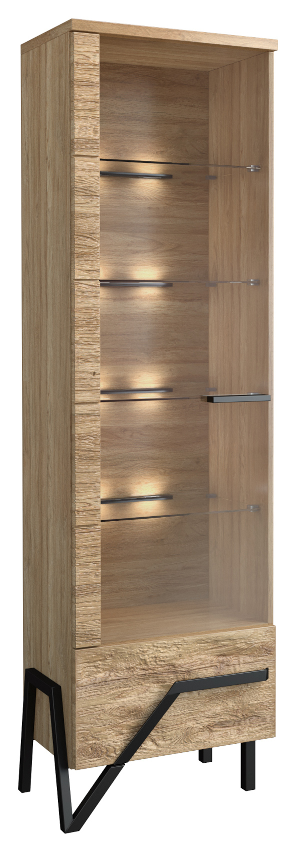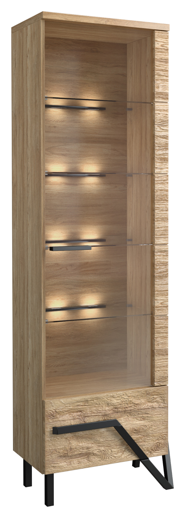 Vitrína Pik I vás zaujme svým moderním a jednoduchým designem. Přední část nábytku je vyrobena z masivního dubového dřeva a korpus je z přírodní dubové dýhy. Kvalitní technologie lakování a moření dodává nábytku přirozený vzhled dřeva a zvýrazňuje strukturu lét. Jeho atypickými prvky jsou kovové práškově lakované nožky, které provzdušní celý prostor. Dvířka mají tiché dovírání.
