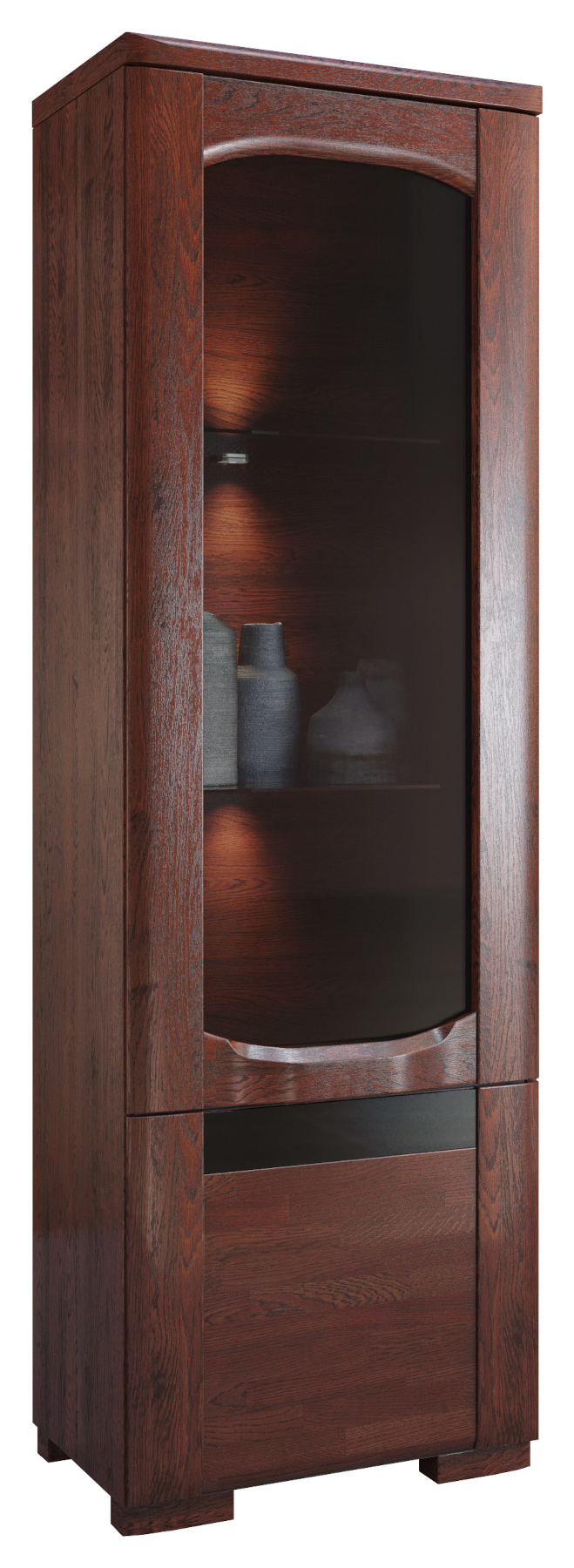 Luxusní vitrína Riva 1D s osvětlením je vyrobena z masivního dubového dřeva a přírodní dubové dýhy s černými prvky ze skla Lacobel. Vzhledem k použitému materiálu se jedná o velmi kvalitní a stabilní nábytek. Čtyřvrstvá technologie povrchového moření a lakování dává nábytku jedinečný design s výraznou strukturou lét masivního přírodního dřeva. Úchyty vitríny jsou z přírodního masivu.