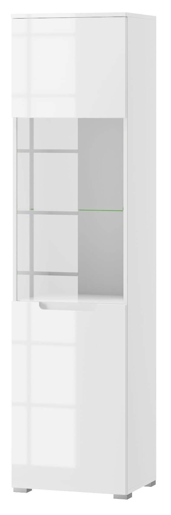 Moderní vitrína Selene 25 vás zaujme svým luxusním designem. Je vyrobena z MDF dřevotřísky s tenkou vrstvou masivního dřeva v kombinaci s kvalitním laminem potaženého bílou fólií. Přední část je v lesku a korpus je matný. Vitrína stojí na nízkých plastových nožkách ve stříbrném odstínu.