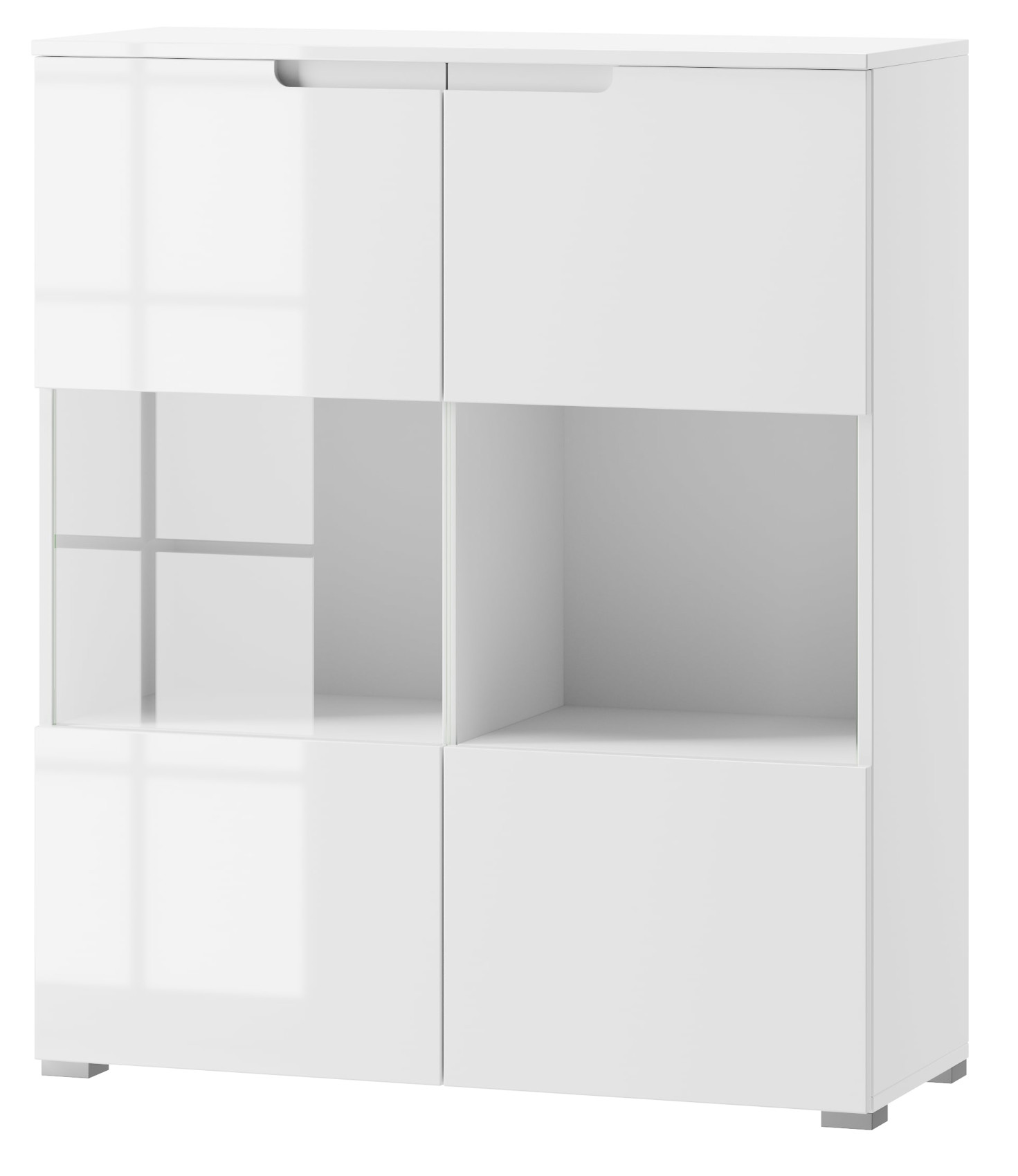 Moderní vitrína Selene 27 nízká vás zaujme svým luxusním designem. Je vyrobena z MDF dřevotřísky s tenkou vrstvou masivního dřeva v kombinaci s kvalitním laminem potaženého bílou fólií. Přední část je v lesku a korpus je matný. Vitrína stojí na nízkých plastových nožkách ve stříbrném odstínu.