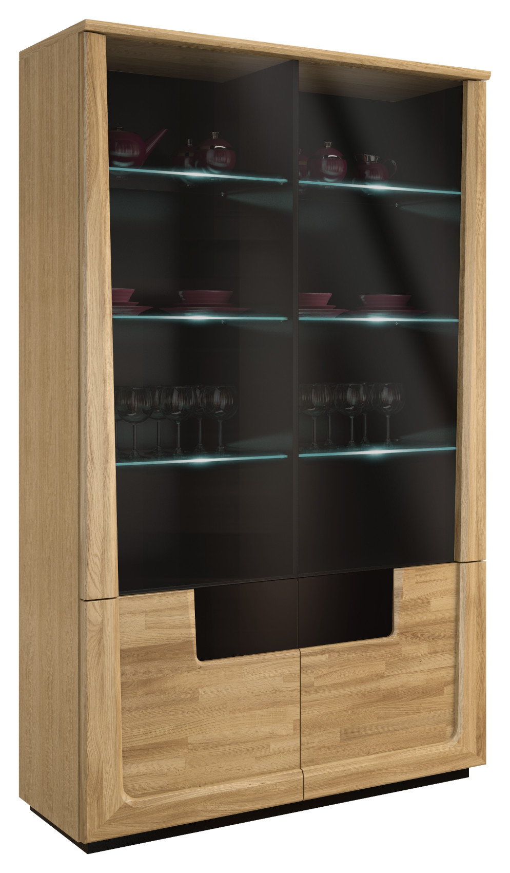Široká vitrína Maganda vás zaujme svým moderním a luxusním designem. Je vyrobena z masivního dubového dřeva s černými detaily ze skla Lacobel. Vzhledem k použitému materiálu se jedná o stabilní nábytek. Kvalitní technologie lakování a moření dodává nábytku přírodní vzhled a zvýrazňuje jeho léta. Máte možnost si vybrat ze 2 barevných variací moření dřeva.