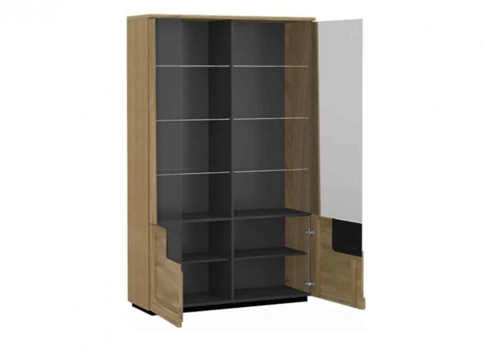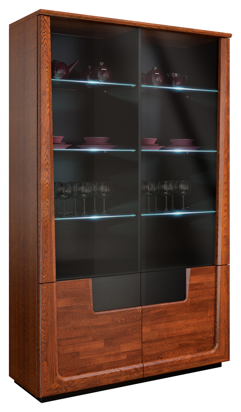 Vitrína je rozdělena do 4 částí. Za skleněnými dvířky je vloženo 6 skleněných polic s LED podsvícením. Osvícení dodá nábytku nádech elegance, jedinečnosti a zpříjemní vaši večerní atmosféru. Ve spodní části jsou 2 plná dvířka se 2 lakovanými policemi.