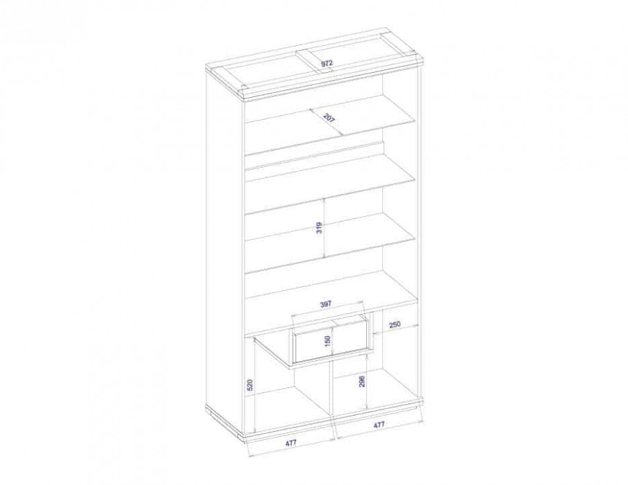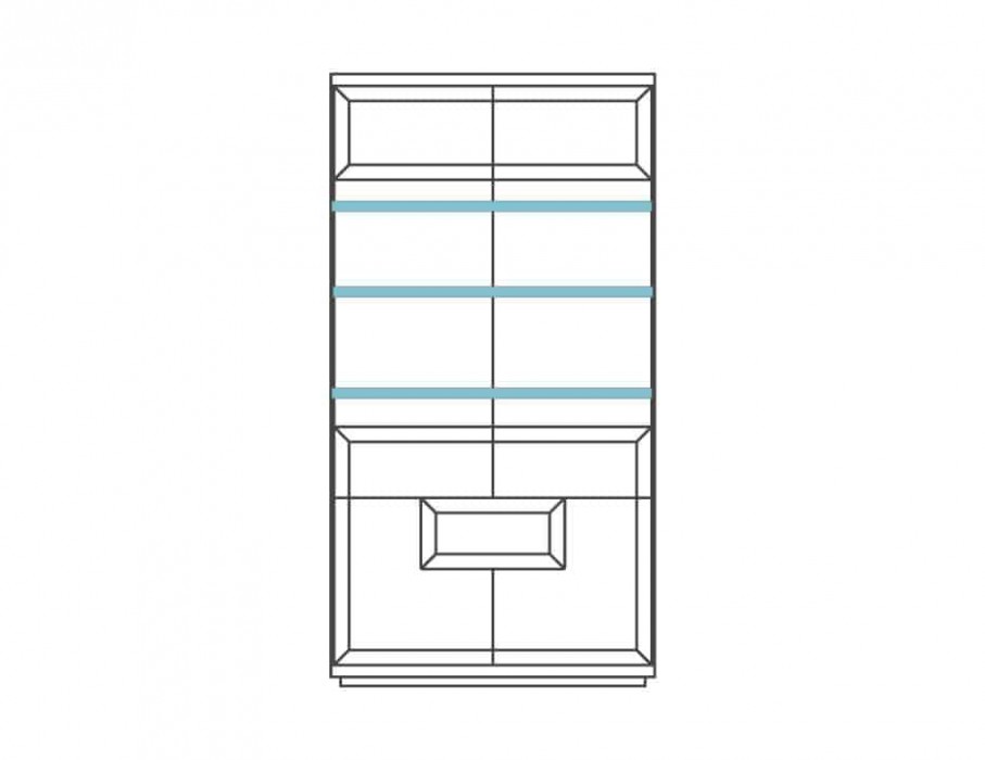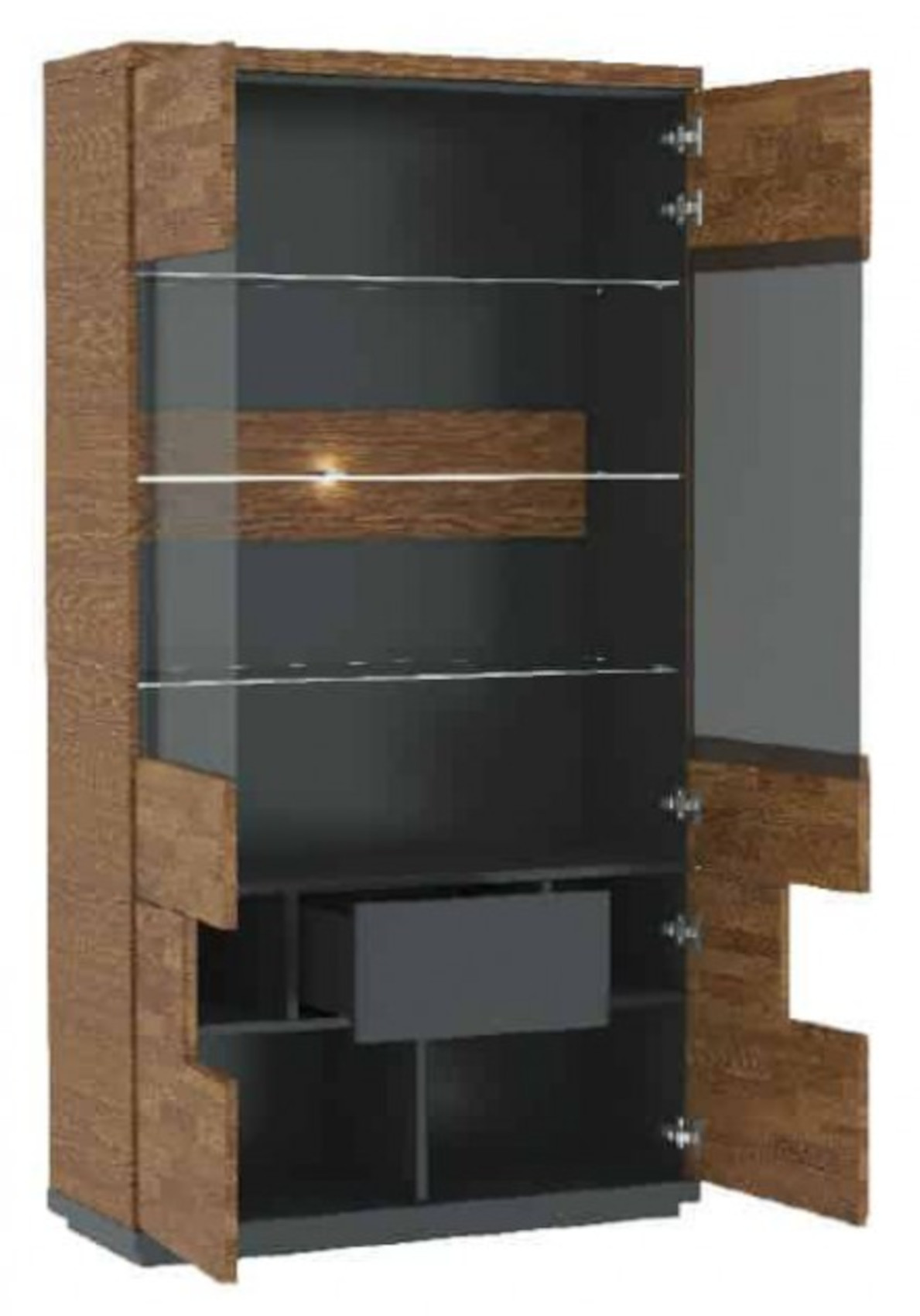 Vitrína má v horní části 2 částečně prosklená dvířka, za kterými jsou vloženy 3 skleněné police. Skleněné police mají LED podsvícení, které dodají nábytku nádech luxusu a jedinečnosti. Ve spodní části jsou plná dvířka se zásuvkou na kovových pojezdech.