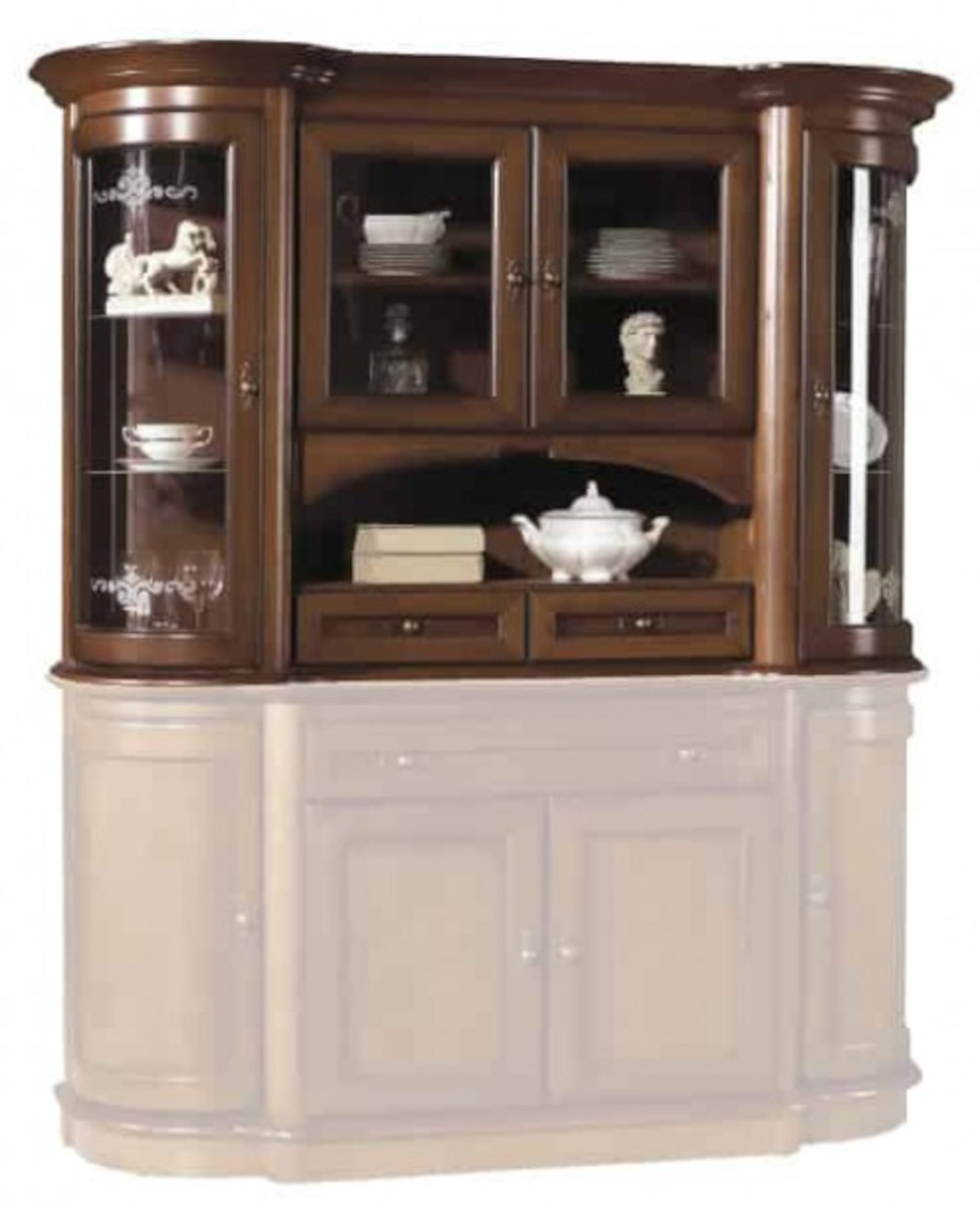 Vitrína má 4 prosklená dvířka se 2 skleněnými policemi a 2 zásuvky na kovových pojezdech. Nad zásuvkami je prostorná nika, kde si můžete vystavit své oblíbené dekorace.