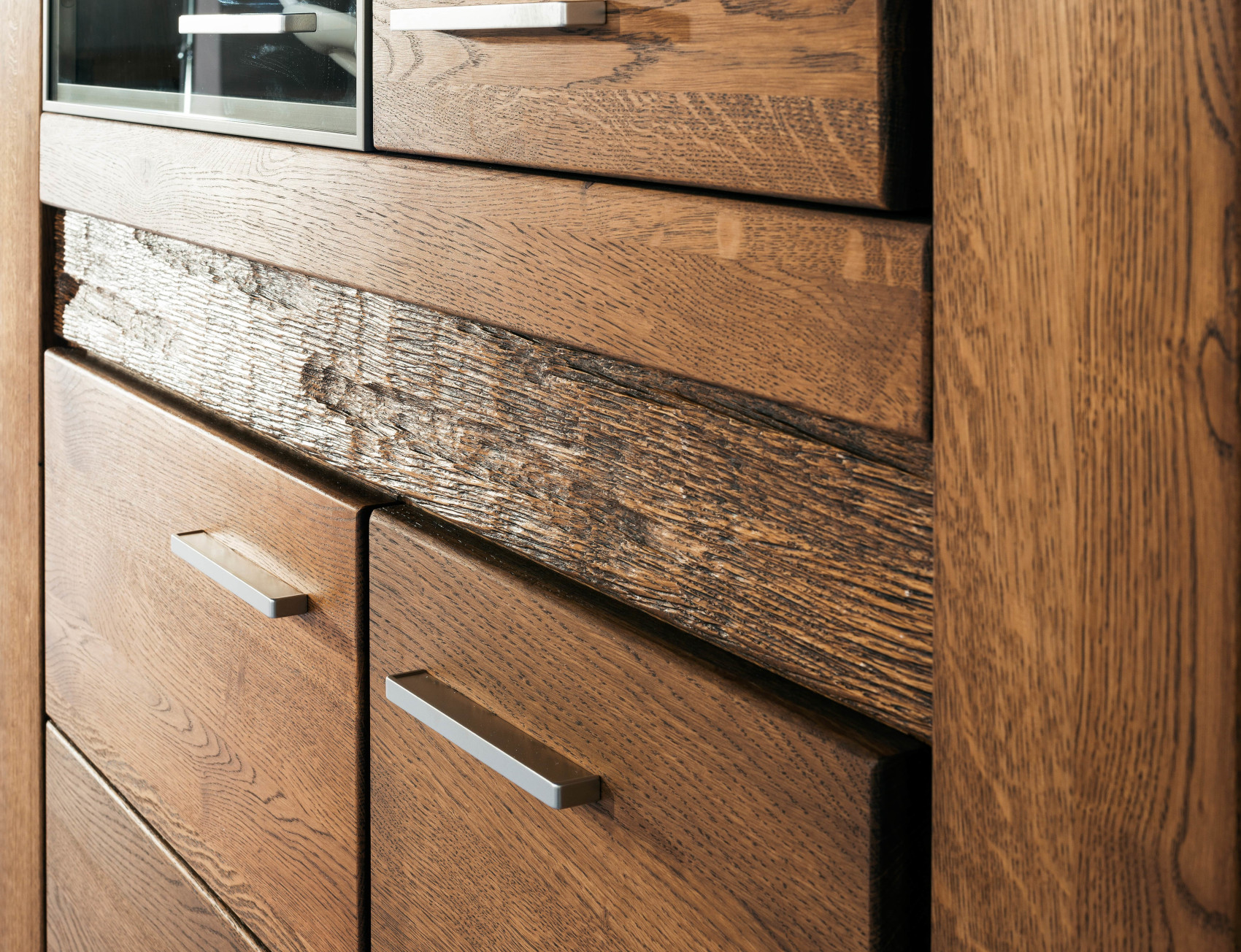 Moderní vitrína Velvet 15 vás zaujme svým elegantním a přírodním designem s viditelnou strukturou dřevěných lét. Přední část vitríny je vyrobena z masivního dubového dřeva a korpus z přírodní dubové dýhy. Veškerá dvířka mají kovové úchyty. Nábytek je doplněn LED osvětlením mezi horní a spodní částí.