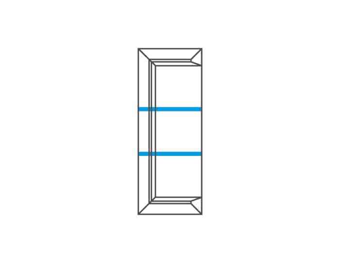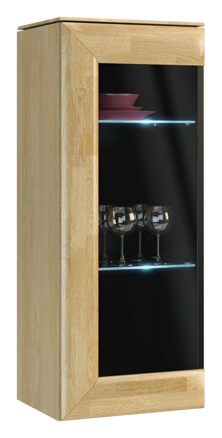 V jednodveřové vitríně jsou vloženy 2 skleněné police s LED podsvícením. Osvětlení dodává nábytku nádech luxusu a jedinečnosti.
