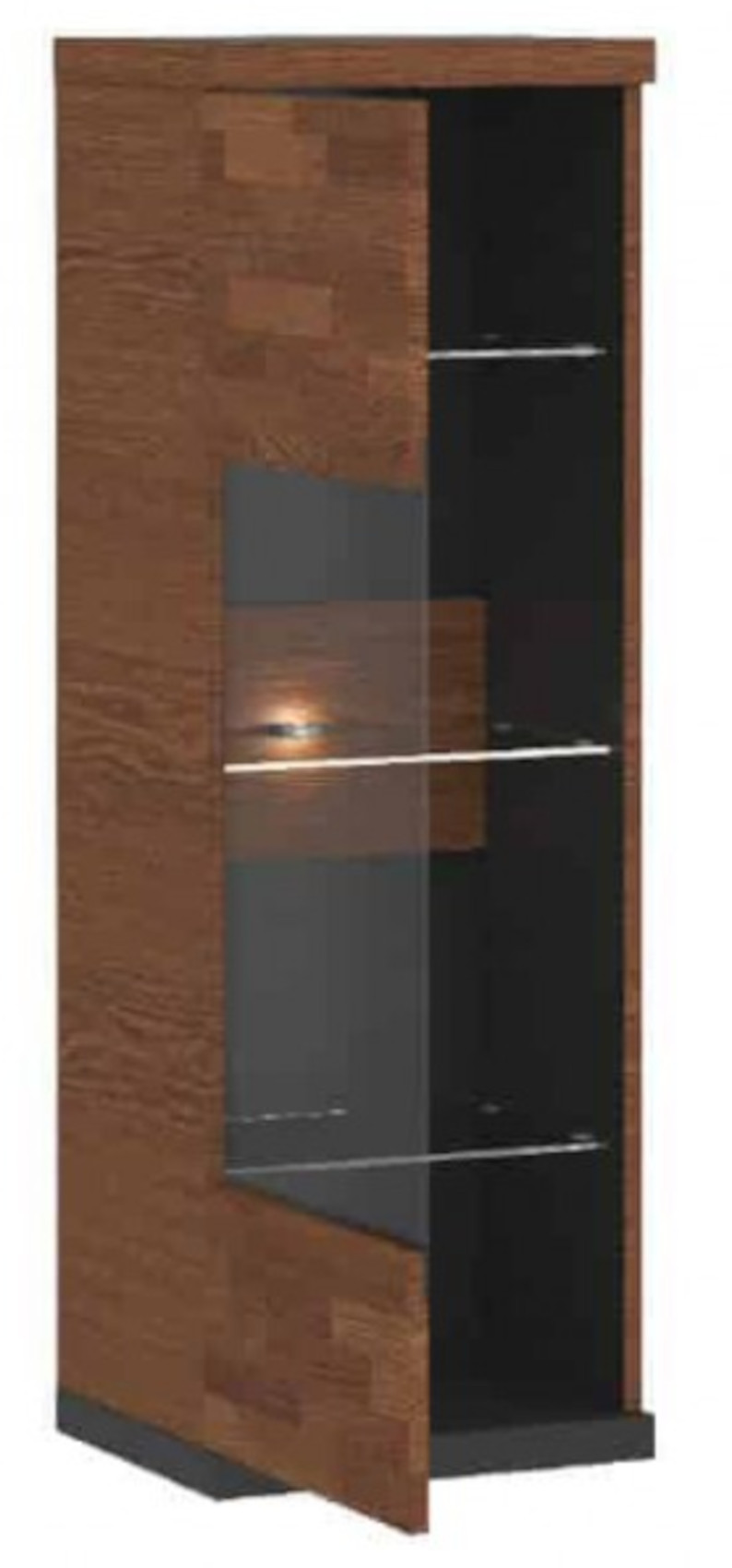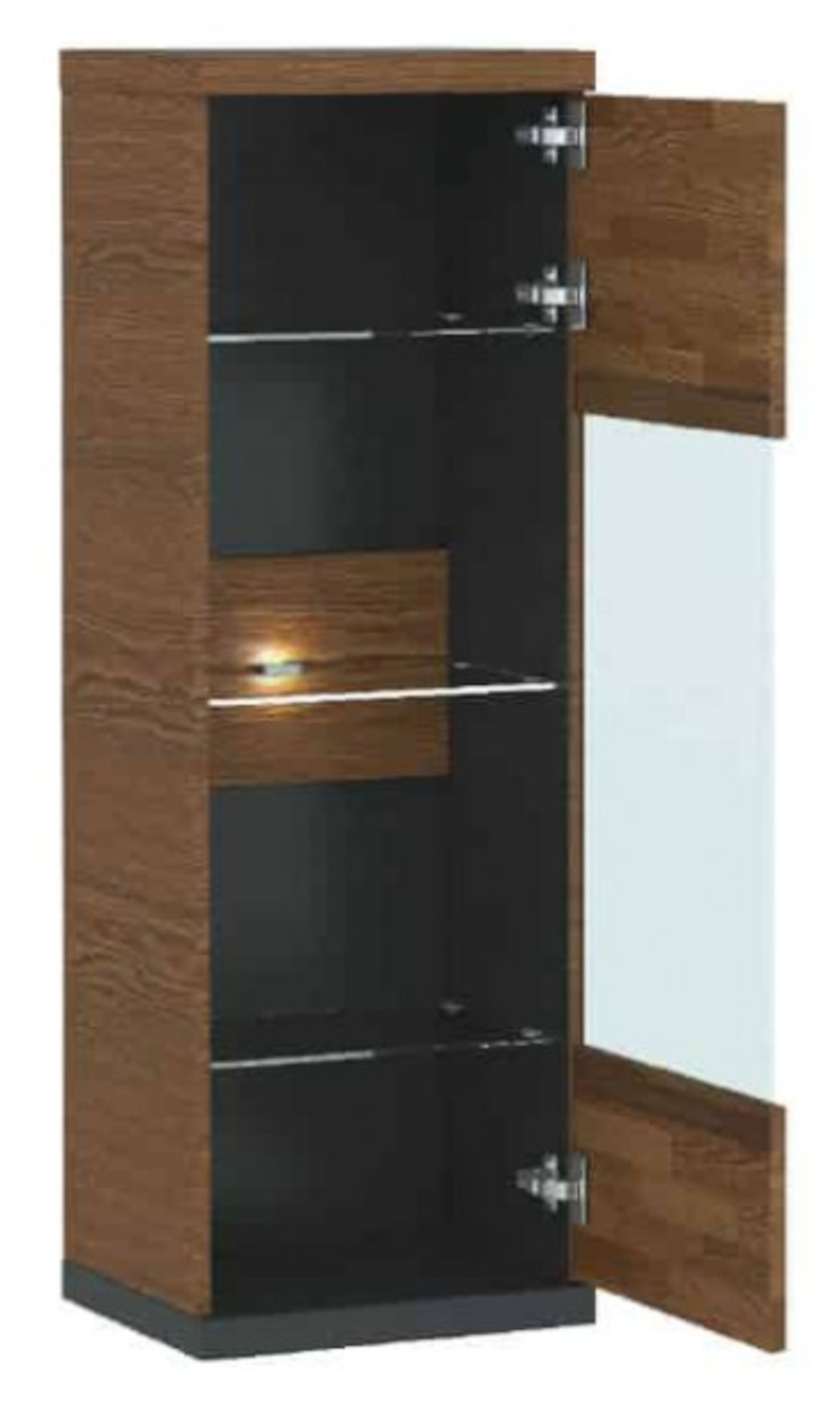 Luxusní vitrína Verano 1DS je vyrobena z masivního dubového dřeva a přírodní dubové dýhy s černými lakovanými prvky. Čtyřvrstvá technologie povrchového moření a lakování dává nábytku jedinečný design s výraznou strukturou lét masivního přírodního dřeva.