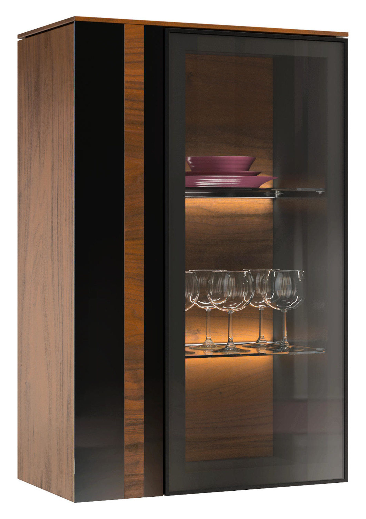 Ve vnitřním prostoru vitríny jsou vloženy 2 skleněné police s LED podsvícením, které nábytku dodá nejen nádech luxusu, ale i příjemnou atmosféru při dlouhých večerech. Ovládání LED podsvícení je pomocí senzorového vypínače.