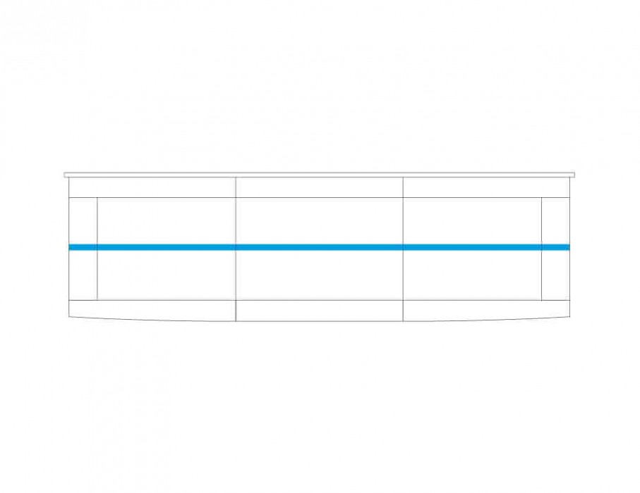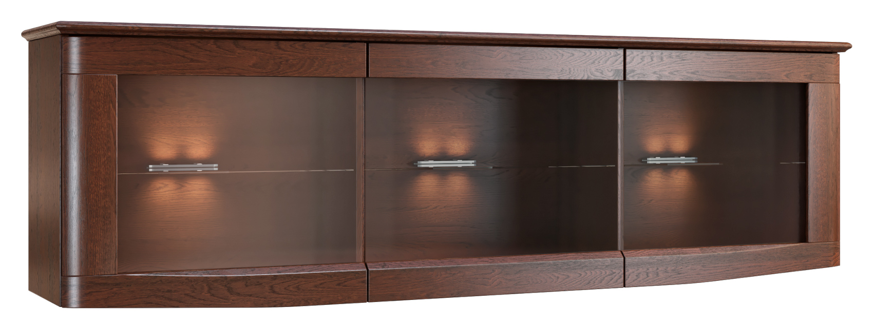 Vitrína má 2 krajní prosklená dvířka, za kterými jsou vloženy 2 skleněné police. Prostřední část je otevřená s 1 skleněnou policí. Skříňka je doplněna LED osvětlením, které navodí příjemnou večerní atmosféru.