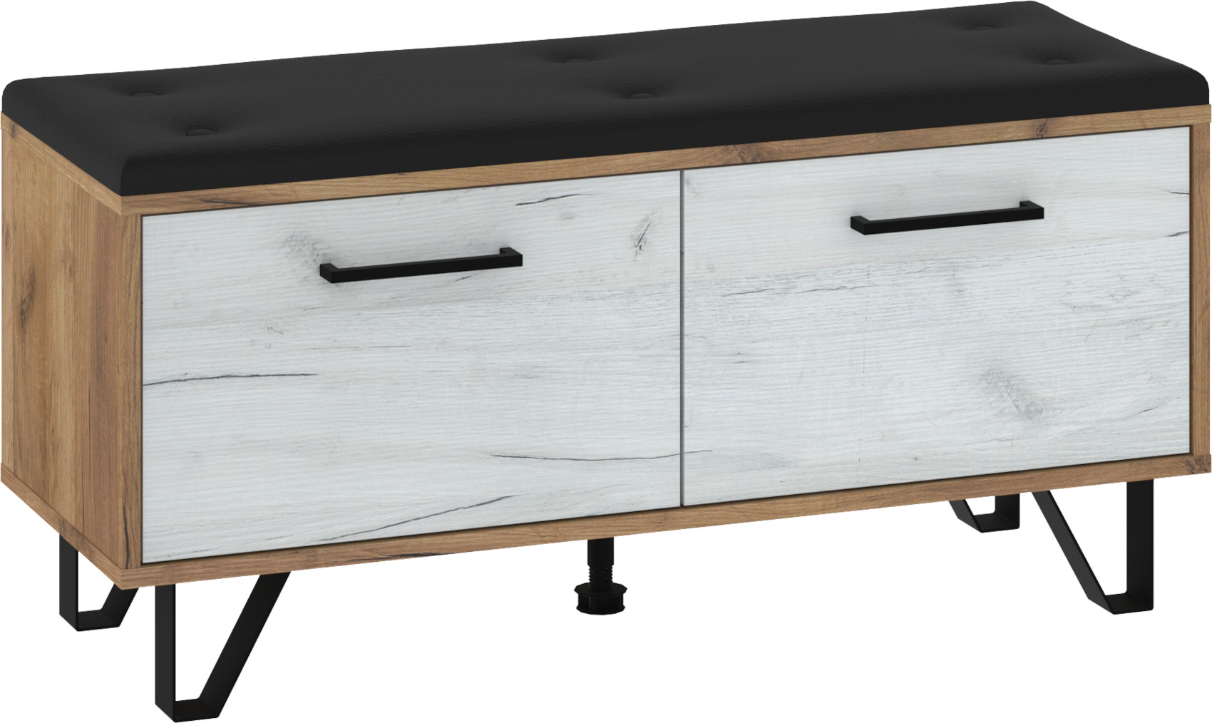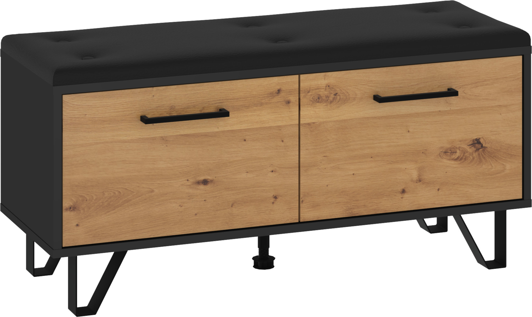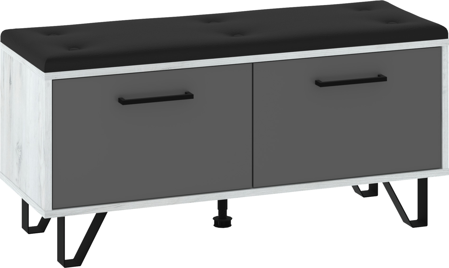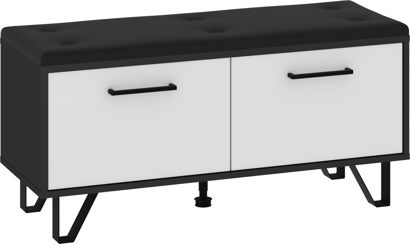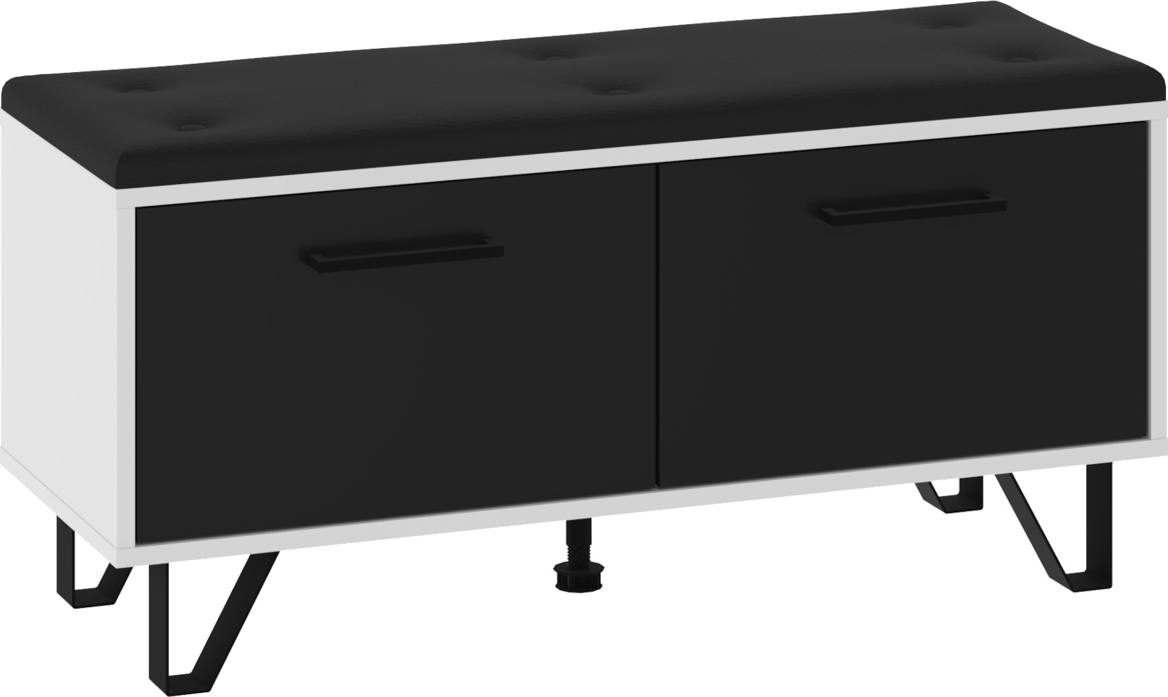 Součástí botníku jsou 2 dvířka. Na skříňce je přidělaný čalouněný sedák z černé ekokůže.