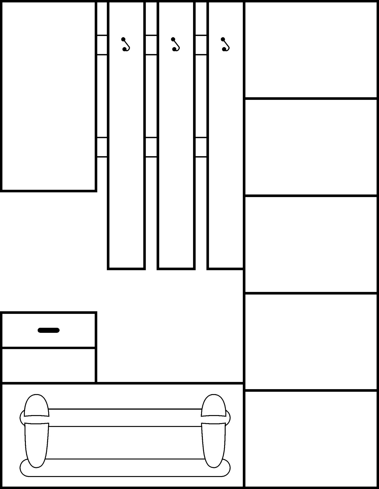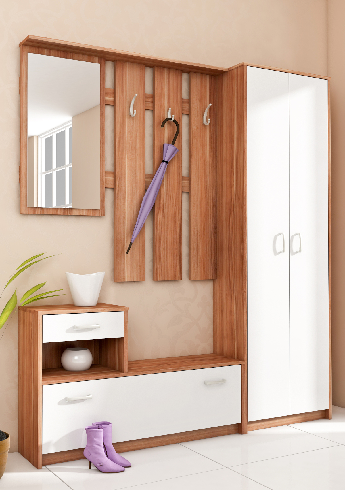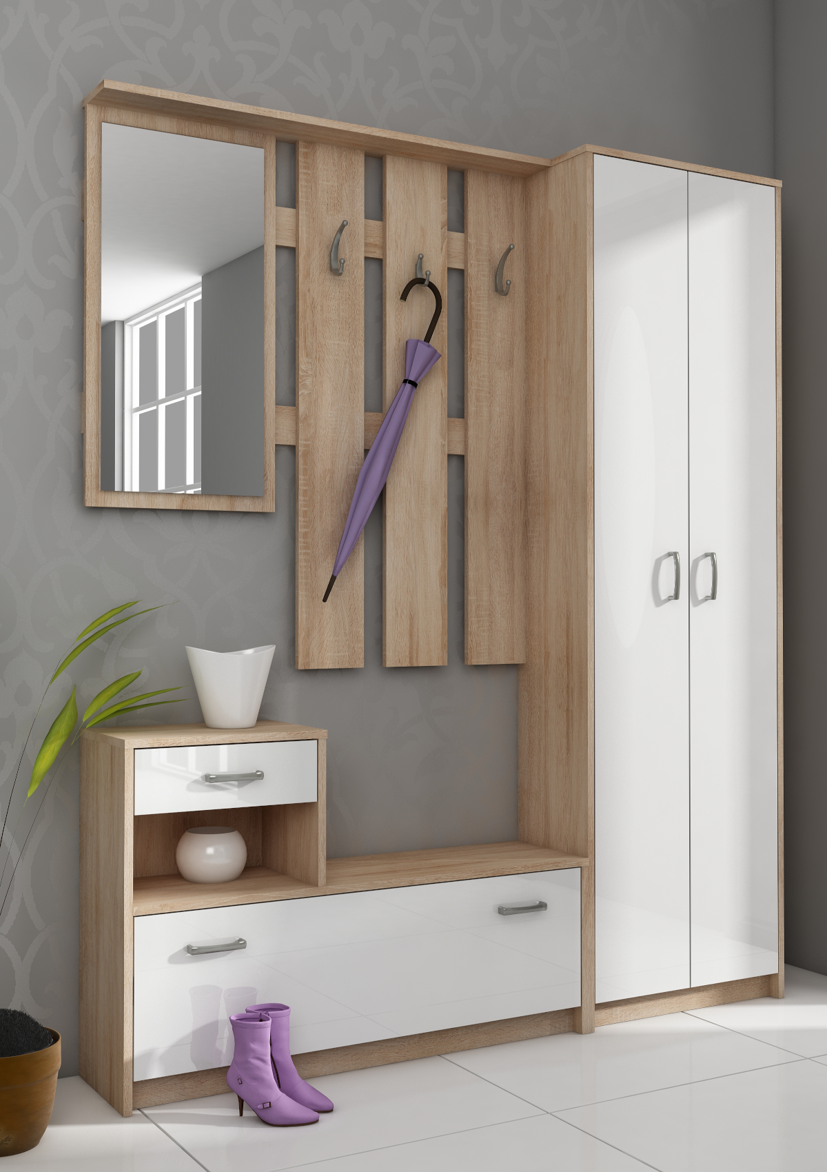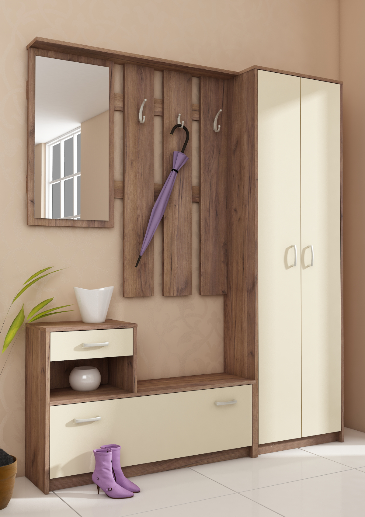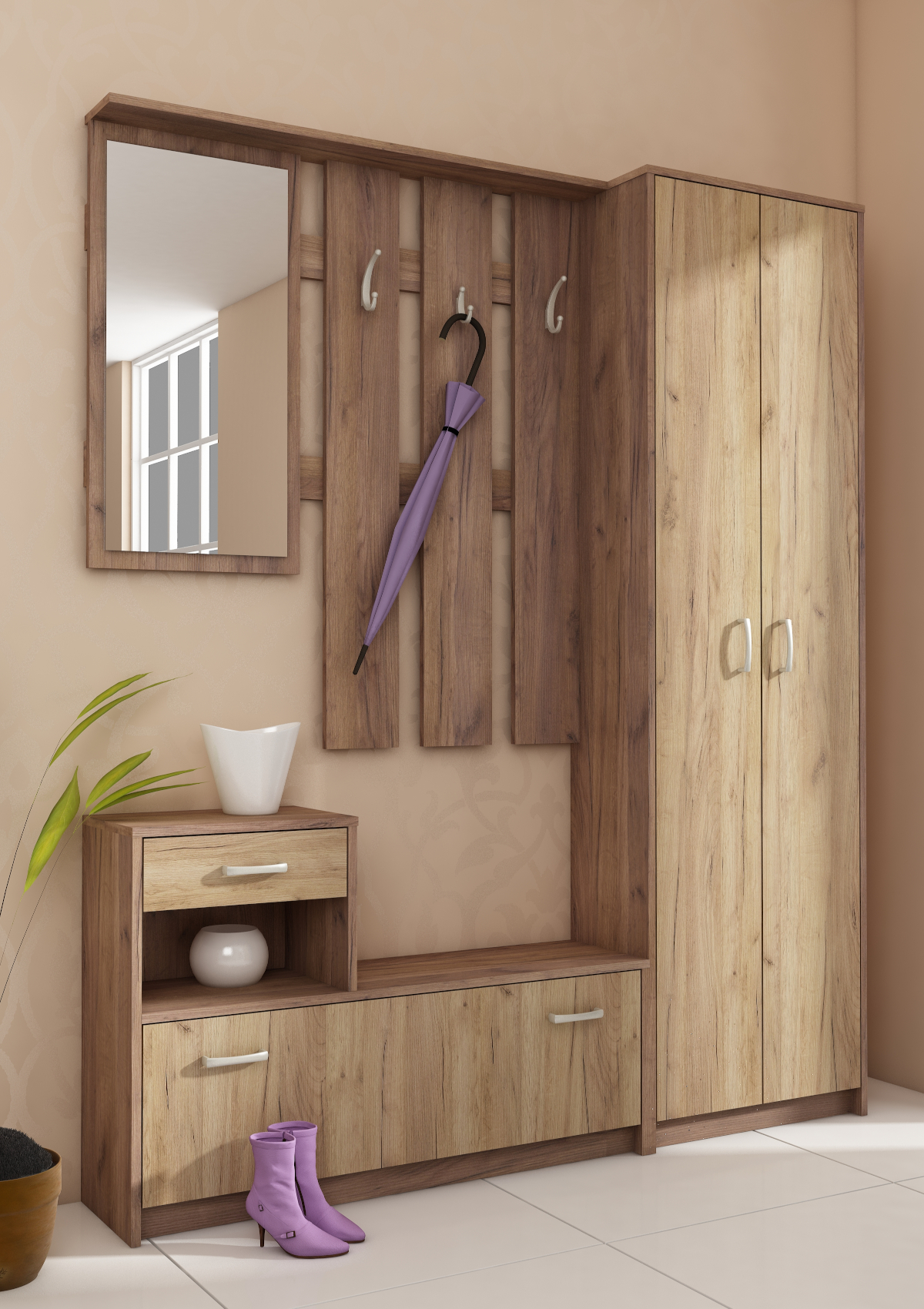 Moderní předsíňová stěna 1 je vyrobena z lamina o síle 16 mm, výběr z několika trendy barevných variant. Stěna obsahuje šatní skříň se čtyřmi policemi, věšák, zrcadlo a botník s výklopnými dvířky a jednou menší zásuvkou.
