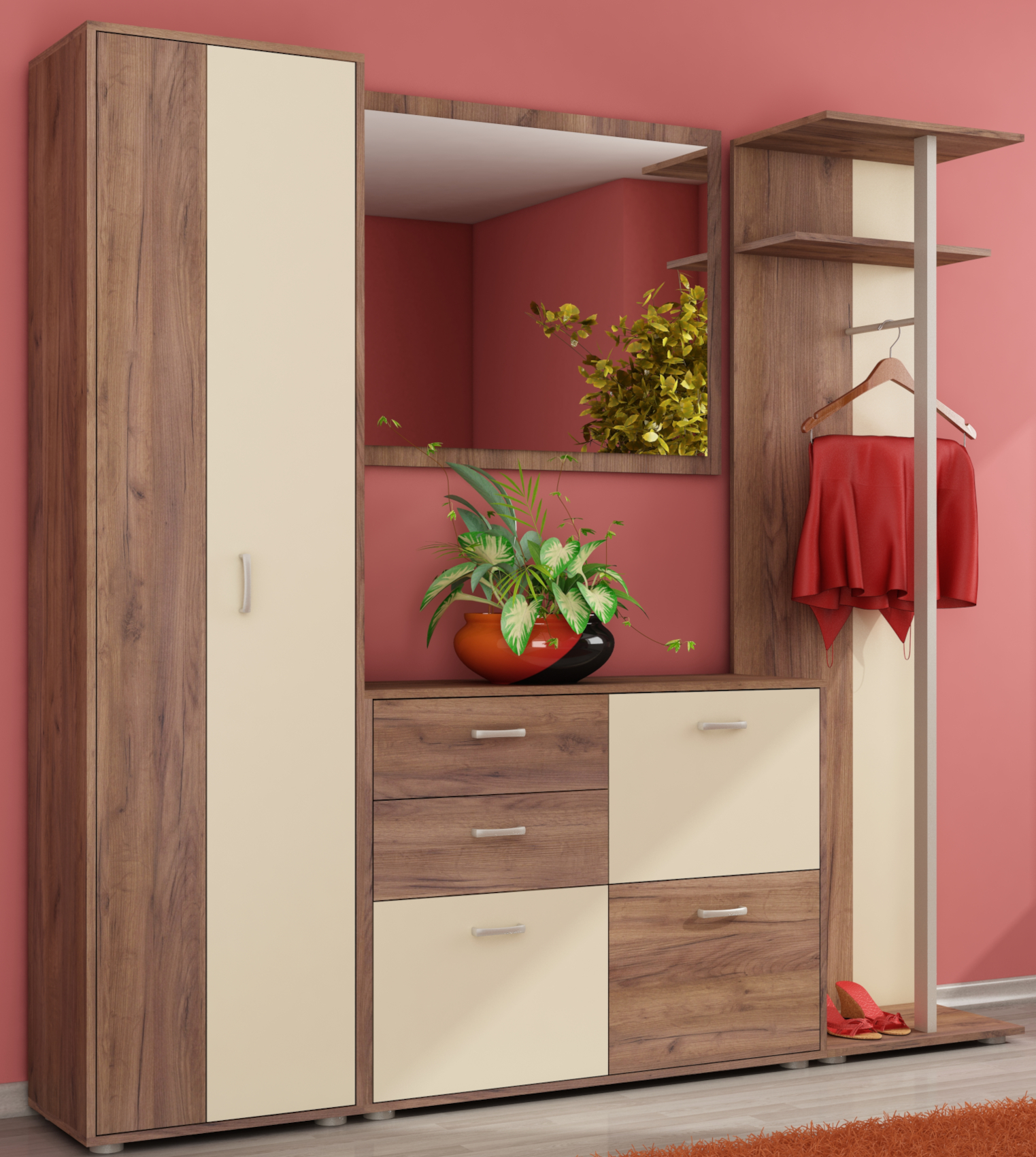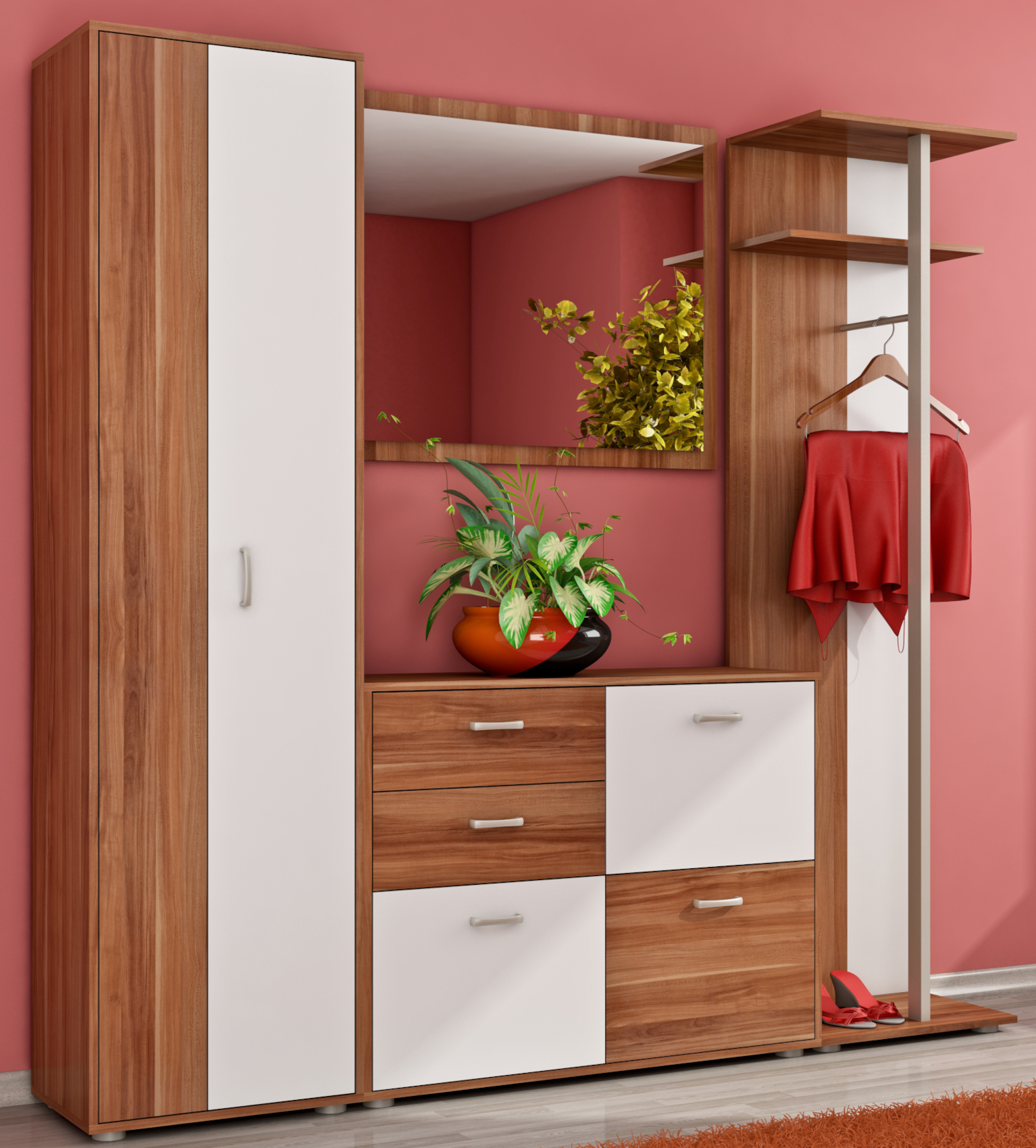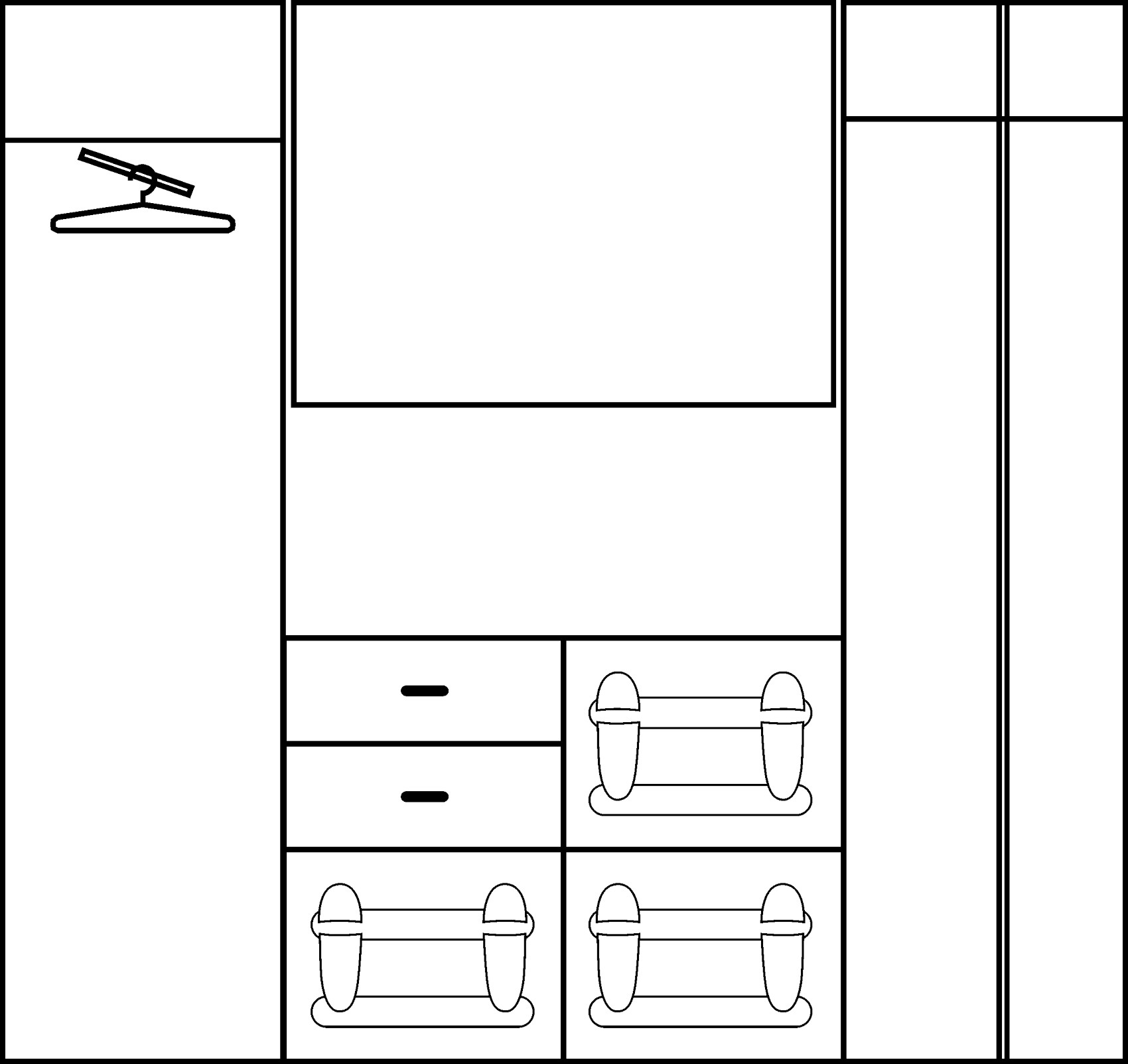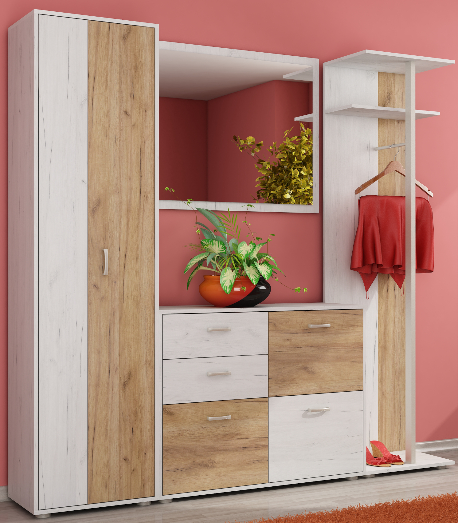 Prostorná předsíňová stěna 7 Vás zaujme především svým velkým úložným prostorem. Uvnitř šatní skříně je šatní tyč a v horní části je police. Střední skříňka má 3 výklopné botníky a dvě zásuvky. Předsíň je vyrobena z 16 mm lamina, výběr z několika barevných variant.